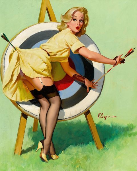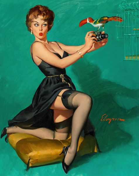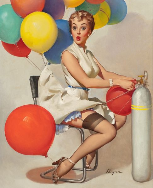 Editor: This is "Something’s Bothering You," a 1957 oil painting by Gil Elvgren. The woman seems startled, almost caught in the act of something. What's your read on this? Curator: The image immediately strikes me as a playful representation of feminine ideals and anxieties of the era. Look at the way the floating lanterns mirror her fleeting thoughts or concerns. What 'bothers' her might be multiple possibilities. Editor: Interesting! The lanterns seem so carefree, while her expression is much more complex. Is that contrast deliberate? Curator: Precisely! Elvgren often uses these visual juxtapositions to play with the viewer's perception. The parasol, held almost like a cigarette holder, also speaks to the changing roles and expectations of women in the mid-20th century, using props that act as symbolic anchors. Editor: So, beyond just being visually appealing, these pin-up paintings contain layered messages? Curator: Absolutely. They're windows into the cultural subconscious, revealing idealized images but also unspoken tensions. Her poised posture conflicts with her obvious unease, revealing cultural pressure that lingers beneath. Do you pick up on that internal conflict? Editor: I do, especially seeing the context you've provided. I never considered how much social commentary could be packed into this style. Curator: The beauty of images lies in their capacity to communicate beyond words. Even lighthearted subjects such as these can carry great emotional and social weight. Editor: That gives me a fresh perspective. Thanks! Curator: My pleasure! Now you’re equipped to perceive continuity and visual dialogue, understanding both emotional subtexts and underlying memory reflected through art.