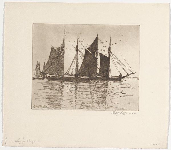 Curator: This etching from 1916, "Bound Out" by Philip Little, really speaks to the anxieties and ambitions of its era. What strikes you most about it? Editor: Well, it’s deceptively simple – just a boat on the water. But the textures in the etching, the reflections... there's something almost melancholic about it. It feels very isolated, somehow. How do you interpret this work? Curator: The isolation is key. The image places emphasis on industrial development. We must look at the socio-political context and reflect on class, gender, and labor during this historical moment in the United States, specifically with this representation of a lone ship. How did labor affect communities dependent on the ocean's resources? What was the artist’s social class, and how did it affect his art? The scene might look serene, but is that truly what’s happening? Editor: That’s a really interesting point. I hadn’t really thought about it in terms of the labor movement, but seeing it as an artifact of a very specific historical moment does shift things. What is Philip Little trying to say? Curator: Perhaps Little is showing us a transition period; the lone ship going to face larger global issues. We must ask who and what benefits, and what social effects do you think are happening? Do you find a similar story that still occurs in our time? Editor: It almost feels like a statement about resilience. Despite that isolation, that single boat is heading out, moving forward. It resonates. I will never be able to unsee labor and other contexts! Curator: Exactly! This way we may look deeper, as each new question reframes an artwork beyond merely aesthetic appeal into reflections of society itself.