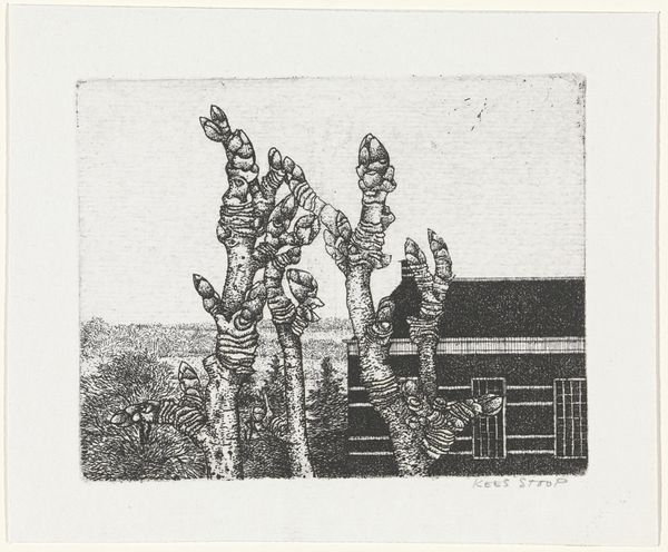 Curator: This compelling print is "Begroeiing voor een muur," which translates to "Vegetation for a Wall," made by Kees Stoop sometime between 1944 and 1990. It’s a linocut now residing here at the Rijksmuseum. Editor: Stark. The sharp contrast immediately catches my eye. The thick, dark strokes create such a dense, almost claustrophobic feeling. There's a definite sense of compression between the flat, textured plane of what I assume is the "wall" and the sky beyond. Curator: I'm intrigued by the period he made this, stretching from World War II to the end of the Cold War era. Stoop, working within that time, may have intended the "wall" as a symbol of barriers—political, social, or even psychological. Look closely at the almost aggressive verticality of the stems, pushing against this perceived barrier. Editor: Yes, the composition reinforces that sense of division. Notice how the upper band, the "wall," is a solid field of near-black, set against the relatively brighter plane above with its stark white and darker foliage, divided into the wall and that which lies beyond. It draws the eye upward. Curator: Linocut as a medium lends itself well to this interpretation. It allows for strong, graphic imagery, stripped of nuance. It reinforces this idea of stark divisions—black and white, us and them—prevalent during the global conflicts of his time. The lack of color adds to that raw intensity. Editor: Technically, the details in the vegetation are rendered with incredible precision despite the relative coarseness of the medium. Stoop utilizes negative space to define individual leaves and seedpods, adding a surprising amount of detail to the plants pushing upwards. Curator: Exactly! Perhaps he uses the resilient persistence of plantlife as a metaphor for the indomitable spirit of those who, at that time, lived under oppression or constant surveillance. Editor: Considering its inherent formal qualities—its contrast, texture, and deliberate composition—I appreciate how "Vegetation for a Wall" creates this emotional tension, prompting consideration of the limitations of this constructed visual experience within the chosen medium. Curator: Agreed. Considering this work in relation to that particular period in Dutch history definitely allows for a powerful understanding of its intent, adding resonance to Stoop’s vision.