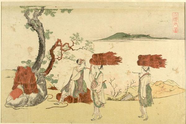 Curator: This is Kitagawa Utamaro’s woodblock print, "Awabi Divers," created around 1788. What’s your initial reaction? Editor: The print has a muted quality, a delicacy of line. But it's unsettling to see these nude figures presented in what feels like an industrious, practical setting. The erotic and the everyday intertwine strangely here. Curator: Indeed. Ukiyo-e prints like this often present layered meanings. The Awabi, or abalone divers, held a fascinating position in society and art. Editor: Considering the materiality, woodblock printing allowed for the mass production of these images, democratizing access to art in a way. How do the materials speak to the piece's context? Curator: Absolutely. And notice how Utamaro uses the medium itself to create textures, particularly in the water and foliage. He creates depth with the layered impressions. More subtly, the abalone itself was understood to hold significant symbolic value… Editor: A luxury food item then. Was the work directed toward a male, wealthier consumer, given the nude female forms and focus on a delicacy like abalone? Curator: Quite possibly, as Ukiyo-e were patronized by wealthy merchants and samurai classes. However, these figures also evoke associations with sea goddesses and folklore, merging sensuality with broader spiritual themes. This interplay allows for multiple interpretations, shifting from earthly pleasures to symbolic representation. Editor: Interesting how what appears straightforward at first glance—nude female laborers—unveils layers of socio-economic, sensual and spiritual significance once we consider its historical context. Curator: Yes, the print encourages us to reflect upon what lies beneath the surface of seemingly simple scenes of labor. Editor: I’ll certainly be giving more thought to the layers of production and symbolism within this delicate image of "Awabi Divers." Curator: Agreed. Utamaro leaves us contemplating the complex relationships between labor, sensuality, and the symbolic potential of everyday life in eighteenth-century Japan.