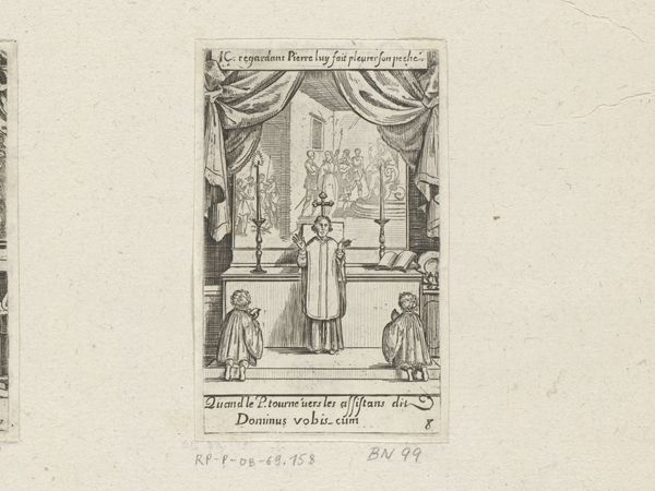 Sébastien Leclerc I created this print, *Priest Before an Altar with Two Altar Boys,* using etching. Notice how Leclerc arranges the composition to draw the eye upward, beginning with the altar boys at the bottom and culminating in the figures at the top. Leclerc uses linear precision to construct depth, especially in the side walls and drapes, giving us a glimpse into an architectural space. The composition is divided into clear, distinct zones: the earthly realm of the priest and altar boys in the foreground, separated by a line from the raised altar space, which ascends to a heavenly backdrop depicting a religious scene. This structural separation emphasizes the connection between earthly ritual and divine narrative. The etching's form invites contemplation on how religious spaces are constructed to facilitate a visual and spiritual journey. Leclerc's structured layering of elements—from the physical to the ethereal—shows how form guides meaning.