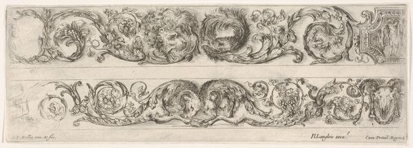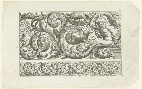 Editor: This is "Twee friezen met bladranken," or Two Friezes with Foliage Tendrils, a drawing by Jean Lepautre from around 1682 to 1706. It’s rendered in ink. The details are incredible, like you could get lost in those leaves! What statements do you think Lepautre might be trying to make with this work? Curator: I find it helpful to place Lepautre’s ornament within the context of its time: the Baroque era. Think about the immense power structures that thrived during that period—the monarchy, the church. These institutions used visual language to legitimize their authority. Ornament, like that depicted here, wasn't just decoration; it communicated status, wealth, and control. Consider the figures included here, such as the cherubs. Editor: They do add an air of opulence. But, how do they also act as more than just decorative flourishes? Curator: Exactly. They borrow from classical allegories while subtly reinforcing contemporary values. Lepautre's friezes, while beautiful, participate in a larger system where even seemingly innocuous designs serve a political function. It prompts us to reflect on the messages embedded within seemingly “neutral” forms. How do such displays reinforce the existing societal framework? Editor: That's a pretty powerful role for decoration. I never thought about ornamental art in terms of political and societal norms. Curator: Often, the most pervasive forms of power are those we overlook. Even an elaborate ink drawing such as this offers a critical window into the values of its time. How can analyzing designs like these allow us to interrogate modern power structures in new ways? Editor: This makes me rethink every fancy border I see. Thanks, I'm leaving with a whole new perspective!