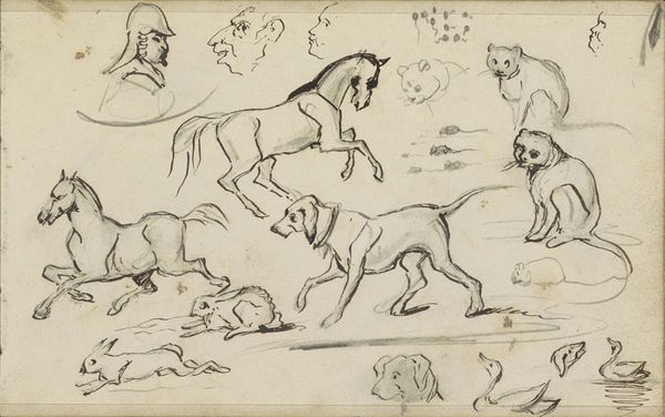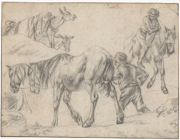 Curator: Here we have Ernest Meissonier’s, “The Herald of Murcia and Other Studies”, dating back to around 1860. It's an ink and pen sketch, alive with movement. What's your initial take? Editor: My first thought? Organized chaos! It's raw, energetic, almost feels like catching a glimpse into the artist's creative process. Curator: Exactly! It showcases Meissonier's deep engagement with material process. He was obsessed with the right type of pen, the precise consistency of ink and how those details played into capturing these historical figures, predominantly the rider and his horse. Editor: Which invites the question: Who is this herald and what's his story? Why Murcia? Meissonier clearly chose to depict men with their power, their war and military culture during a complex period of European history. The sketch raises broader questions about national identity, power, and who gets remembered by history, since there is another man holding his horse's bridle. Curator: Indeed. You see how his skill in draftsmanship isn't just about accurately rendering form, but is really crucial for production of such historically significant figure for those interested in 19th century history painting. Also look closely at the type of paper and even the specific ink pigment he employed to see the intense preparation undertaken by Meissonier. Editor: Yes, but considering history painting and military culture, what perspectives are consciously or unconsciously excluded? The women who provisioned them, for example, and those subjugated in the process? How does it affirm or subvert these entrenched power dynamics? Curator: I think Meissonier, given the materials he used, provides us with insight into his historical moment and artistic choices as to what to depict through available techniques in service of a client who could afford access to those materials. Editor: Point taken, and appreciating the materials definitely brings me back to contemplating the narrative surrounding such sketches: a call to examining our cultural heritage with critical lenses. Curator: Agreed! Reflecting on these production sketches and their ability to engage the artistic process and raise insightful discussions with broad applications is invaluable! Editor: I concur, appreciating Meissonier's choices fosters better discussions.