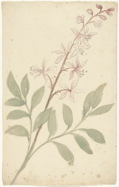 Robert Jacob Gordon rendered this watercolor depiction of Chenopodium foliosum, or Leafy goosefoot, using delicate lines and muted washes. The plant's form, dominated by a central stem adorned with vibrant red berries, immediately draws the eye. The composition divides into two distinct parts: one side featuring the complete plant, and the other a partial view, emphasizing the root structure. Gordon's interest lies in the plant's morphology, meticulously capturing the texture of the leaves and the rhythmic arrangement of the berries. The contrast between the feathery quality of the upper foliage and the sturdy stem emphasizes nature’s balance of fragility and strength. The artwork's scientific intention transcends mere representation. It is structured, providing a systematic view that engages with the Linnaean taxonomy of the time, classifying and understanding the natural world through detailed observation and categorization. Gordon destabilizes a purely aesthetic appreciation of nature, and encourages an intellectual interpretation, one rooted in empirical analysis.