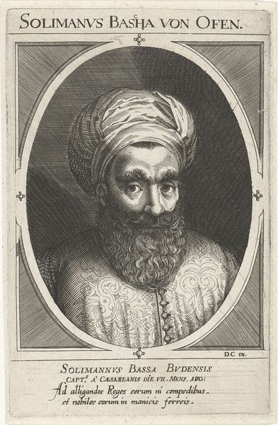 Curator: The intensity in the gaze is immediately striking. What is your first take on this piece? Editor: There's a captivating severity. Look at how the fine, controlled lines create such texture, from the elaborate folds of the cap to the wiry strands of the beard. The high contrast intensifies the commanding presence of the figure. Curator: You're drawn to its textures. Well, we’re looking at a work titled, “Portrait of Pietro Aretino” crafted by Marcantonio Raimondi. This piece, residing here at the Metropolitan Museum of Art, dates back to sometime between 1512 and 1525, an exquisite example of Italian Renaissance printmaking in the intaglio and engraving styles. Editor: Intaglio… so the image is incised, carved out. The labor is remarkable given the level of detail Raimondi achieves. Aretino's portrait becomes almost sculptural, defined by the shadows and depth. But who exactly *was* Pietro Aretino? Curator: Aretino was quite the celebrity—a writer, satirist, and all-around provocateur. Consider him a Renaissance influencer. The image conveys his persona brilliantly; notice how the gaze communicates a confidence and, perhaps, a touch of cynicism. This image circulated widely, cementing Aretino’s image in the cultural imagination. It almost feels like calculated propaganda. Editor: Propaganda, yes, but incredibly elegant propaganda! The swirling patterns of the beard soften some of Aretino's potential harshness. There's also something to be said for the framing text. It amplifies the artwork with additional meaning and provides cultural context by functioning as both description and frame. Curator: Absolutely, the text at the bottom celebrates Aretino. In this sense, this isn't *just* an image, but a carefully constructed declaration of his character and literary might. Raimondi was tasked to visually convey a very specific message about Aretino for his contemporaries and future generations. Editor: Knowing that helps re-focus the piece as a meticulously created, if glorified, representation of an influential figure of its day. This intaglio print preserves Aretino within the textures and carefully controlled contrasts achieved in Renaissance artwork. Curator: Precisely, Raimondi’s print ensures that Aretino’s story, both in image and text, continues to be seen and, interpreted even today. Editor: It does provide food for thought as we appreciate these historical artworks. Thank you.