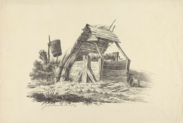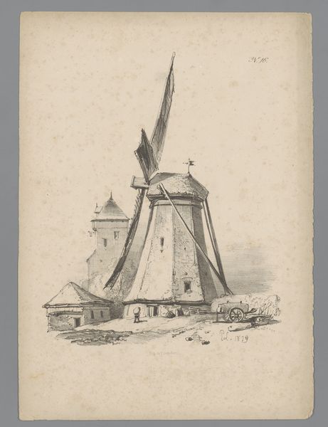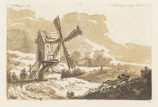 Curator: Looking at this etching, the Ladegaardsmøllen ved Roskilde from 1857, I immediately feel a sense of stillness. Editor: It does have a certain quietude. Is it the almost monochromatic palette of the engraving itself? It evokes the kind of somber reflectivity one finds in the Danish Golden Age, a melancholic pause amid bucolic scenes. Curator: Indeed. This work is realized through meticulous engraving. See how the light delicately renders texture, the weather-worn facade of the windmill. Sibbern masterfully articulates form with just a few well-placed lines. Editor: True. Observe the windmill. It's rendered with almost obsessive detail, set against an open yet indefinite sky. Do you sense that semiotic relationship, this industrial structure sitting tranquilly amid the promise of an agrarian utopia? The mill suggests technology quietly coexisting, a motif echoing debates around modernization within burgeoning national identities. Curator: You are on to something. Beyond documentation, the image embodies Sibbern’s perception and values. Perhaps it whispers longings for an unspoiled Denmark? It almost hurts. You sense this yearning. I suspect a critique of nascent industrial change may simmer underneath the surface, though almost gently, as through a filter. Editor: Yes! An anxiety woven subtly throughout its detailed lines. As for my first impressions, though serene, something felt amiss—beyond merely a historical record. It resonates as a visual poem expressing the ambivalence, both beckoning and bemoaning modern life. Curator: In closing, looking once more at "Ladegaardsmøllen ved Roskilde," perhaps this artwork demonstrates how much can be said within restraint; less might certainly mean much more, artistically and politically, in that moment and our own. Editor: Exactly! As though that lonely windmill encapsulates an entire world negotiating preservation versus progress in 19th-century Denmark.