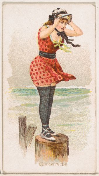 This small chromolithograph, printed by the Wm. S. Kimball & Co., was part of a series called "Fancy Bathers." These cards, produced in the United States during the late 19th century, were originally included in cigarette packs as a way to stiffen the packaging and entice customers. But beyond their commercial function, they offer a fascinating glimpse into the social mores of the Gilded Age. The bathing costume, while modest by today's standards, reflects changing attitudes toward women's public roles and leisure. The figure's self-assured pose suggests a growing sense of female agency, even within the constraints of Victorian society. To truly understand this image, we might consult period fashion magazines, advertisements, and social etiquette guides. These sources help us to decode the visual language of the time and to appreciate how such seemingly innocuous images could reflect and shape broader cultural trends. We can then explore the shifting boundaries of gender and public space in late 19th-century America.