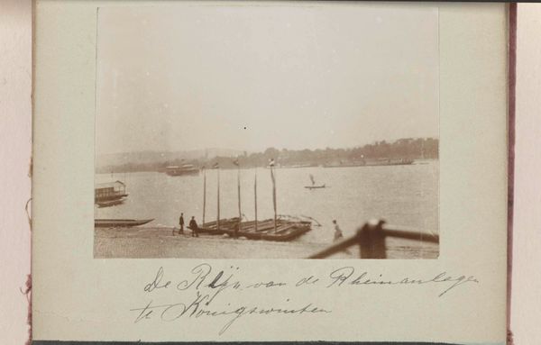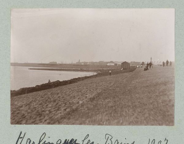 Editor: So, here we have Frits Freerks Fontein’s gelatin silver print from around 1903, titled "People on a Boat with Sandbags Near the Village of Kethel, Flooded by a Levee Breach". It strikes me as quite bleak. The tones are muted, and the subject matter feels heavy with the weight of disaster. How do you interpret this work? Curator: It's a powerful document of a community grappling with environmental crisis. Consider the date, around 1903. This was a time of intense industrialization, yet communities were still vulnerable to natural disasters. The photograph highlights a specific instance – a levee breach – but also points to a larger story of the complex relationship between humans and their environment. Look at the composition. What do you see? Editor: There's a clear division: the flooded landscape, then the boat filled with people and sandbags, struggling against it all. Curator: Exactly! The photograph is more than just a record. It becomes a visual representation of the social struggle, really. The sandbags symbolize an attempt to control and contain, but the figures on the boat also embody resistance and collective action. In this light, the photograph invites a discourse about whose stories get told, and how environmental disasters disproportionately affect marginalized communities. Can we see this as a premonition to a call for ecological justice? Editor: That’s such a different way to see it, far beyond just a historical photograph. Curator: These historical images can be tools to spark critical dialogues about pressing issues, encouraging new ways to perceive the artwork’s importance in our contemporary society. Editor: It is fascinating to examine the layers of meaning within what initially appears as a simple depiction of a past event. Thanks!