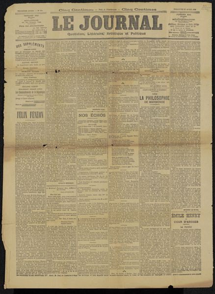 Curator: Here we have “De Avondpost; dagblad voor stad en land”, quite possibly printed between 1898 and 1899. It's currently held here at the Rijksmuseum. The typography immediately strikes me, the weight of the text… what do you see? Editor: It's imposing! Visually dense, you almost feel the weight of information being pressed upon you. It feels distinctly of its time, yet strangely timeless. Curator: The text acts as both a transmitter of news and a cultural symbol. It's interesting how the "aged paper," as noted, contributes to that weight you mentioned. You immediately associate it with history, authority... Editor: Exactly! And considering the function of newspapers, this would have been a key mode of disseminating information, shaping public opinion in a critical era. I think of the role the media has always played, its power for both progress and manipulation, even then. Curator: Yes, the act of printing itself bears weight; typography's evolution reflects technological progress, too, doesn’t it? I consider this object a modern icon representing industrial advances, its very nature entwined with broader narratives of democratization. It suggests this turning point. Editor: Certainly. The Proclamatie grabs the eye. Who did it serve and how would various individuals react to this printed declaration in the street or around a table, shaping people's awareness. Curator: To dive even deeper into meaning, think about newspapers then! The masthead – “De Avondpost” – promising to deliver a comprehensive picture of the world each evening! A stylized text like that suggests stability and permanence amid social transformations, doesn't it? This kind of printing was revolutionary and carried a lot of weight within the country at the time. Editor: True. Reflecting on it, it prompts consideration of power dynamics and access to information at the fin de siècle, particularly in relation to social movements, nationalism, colonialism… it represents much more than what appears at face value. Curator: Indeed, it has sparked further thought and connection, for me, about symbols. Editor: And, from my side, it reinforces the power of art to be evidence!