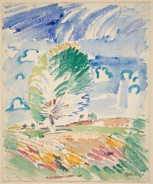 John Marin made this watercolor, Castorland, New York, using loose, energetic strokes, like he was trying to capture the feeling of a place rather than just its appearance. There’s a real sense of process here, of the artist working through his impressions right on the page. The colors are muted, mostly greens and browns, but with these surprising pops of pink and blue that give the whole thing a kind of joyful lift. Look at how he uses the watercolor almost like a crayon in places, scratching and scribbling to build up the forms. It’s like he’s wrestling with the medium, trying to pin down something fleeting. See that dark, zigzaggy line in the foreground? It’s almost like a doodle, but it anchors the whole composition and gives it a kind of playful energy. Marin was always experimenting with ways to capture movement and feeling in his work. You can see that same spirit in the work of someone like Marsden Hartley, another American modernist who wasn’t afraid to let his emotions show. Ultimately, what’s so great about this piece is its openness, its willingness to embrace the messy, unresolved quality of life itself.