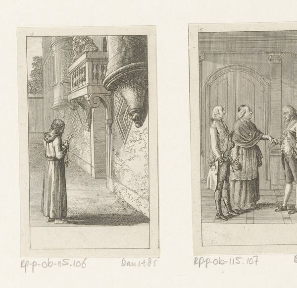 Daniel Nikolaus Chodowiecki created this print, “Karel de grote bij zijn spinnende dochters,” the date of which is unknown, using etching. Chodowiecki lived during the Enlightenment, a period that emphasized reason and individualism, yet his work often depicted scenes reflecting traditional social hierarchies. Here, we see an intimate, domestic scene juxtaposed with a formal, public one. On the left, Charlemagne visits his daughters who are engaged in the traditionally feminine task of spinning. On the right, we see a group of men in armor. The contrast underscores the era's complex negotiation of gender roles. While women were often relegated to domestic duties, their labor was essential to the household economy. This piece, made with delicate lines, highlights the tension between public duty and private life, suggesting that even powerful figures like Charlemagne were subject to the expectations and norms of their time. The artwork invites reflection on how societal expectations shape individual experiences, and how we continue to negotiate these tensions today.