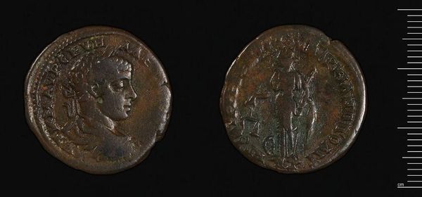 Curator: This bronze medal, titled "Napoléon's Coronation at Paris," was designed by Romain Vincent Jeuffroy and is held at the Harvard Art Museums. The diameter is about 4 centimeters. Editor: The patinated bronze gives it a warm tone, but the composition on the reverse side feels almost theatrical, like a stage play. Curator: Indeed, the imagery is quite deliberate. The laurel wreath, a classic symbol of victory and honor, crowns Napoleon's profile. The reverse scene depicts figures raising a draped statue, possibly alluding to his ascension. Editor: The craftsmanship involved in die-striking such detail into metal is impressive. It speaks to the labor and skill invested in creating a powerful message about the emperor's reign. Curator: The medal serves as a symbol, commemorating a specific moment in history but also propagating an idealized image of power and authority. Editor: Looking at it this way, the medal becomes more than just art, it becomes a piece of carefully constructed propaganda. Curator: Precisely, and understanding the cultural symbols is essential to decoding its layers of meaning. Editor: It certainly makes you think about the materials, the message, and the context within which it was made.