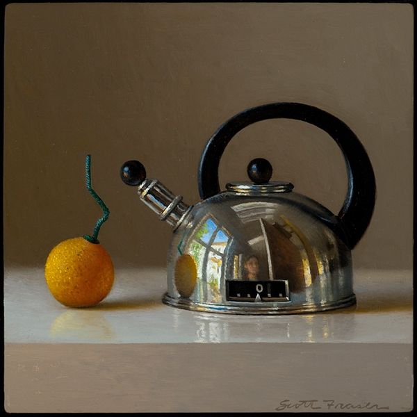 Scott Fraser made "Teapot with String" with oil. It’s a meticulously rendered still life with incredible verisimilitude. The reflective surface of the teapot steals the show. It's like a little mirror reflecting the world back at us, but also distorting it, bending reality. The string, tied to a pin, droops and creates a tangible sense of depth. You can almost feel the texture of the rough wood. The paint is applied so smoothly, it's almost invisible as paint, which is a feat, right? Look closely at how Fraser captured the highlights on the teapot, those tiny glimmers of light that make it seem so real. They remind me of the Dutch Masters, those old-school painters who could make anything look like you could reach out and touch it. At the same time, it’s so contemporary. It reminds us that art is always in conversation with itself, borrowing and remixing. It’s about the act of seeing, and all the different ways we can make sense of what's in front of us.