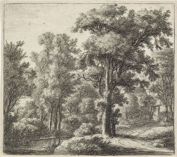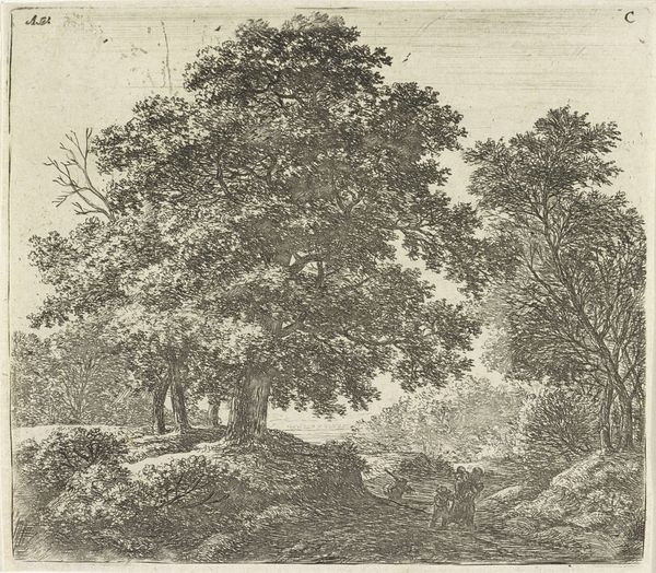 Anthonie Waterloo created this print, "Two Figures with a Dog on a Forest Path," using etching techniques. The composition is dominated by dense, meticulously rendered trees. The eye is immediately drawn to the intricate patterns of foliage and branches which fill the upper two-thirds of the frame and whose texture is contrasted by the open sky. The figures are relegated to the lower left, almost absorbed by the landscape. This positioning diminishes their importance, emphasizing nature's grandeur. Waterloo's print destabilizes the traditional hierarchy between figure and ground. It invites us to consider the autonomy of nature. The detailed etching technique adds a layer of complexity and allows the artist to experiment with line, texture, and the tonal scale. This is not merely a scene but an exploration of the graphic possibilities inherent in the medium. The print functions as a meditation on nature's overwhelming presence and invites ongoing interpretation of the relationship between humanity and the natural world.