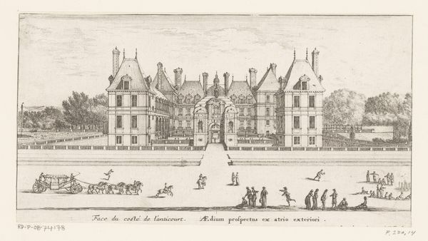 Curator: This engraving, held at the Rijksmuseum, presents "Gezicht op het kasteel van Rochefoucauld met tuin ervoor," or "View of the Rochefoucauld castle with the garden in front of it" created by Israel Silvestre between 1631 and 1661. It exemplifies the Baroque style. Editor: It immediately strikes me as orderly, but with a slightly unreal quality. The sharp lines create an almost hyper-realistic architectural rendition, but the scale of the figures seems somewhat detached from the building. Curator: The formal garden design with intricate parterres signifies wealth and control over nature, elements very central to Baroque ideals. Think about what such imagery would communicate to viewers at that time. What stories of power do you think it tells? Editor: Indeed, that manicured precision certainly suggests domination. However, looking at it formally, the contrast between the delicate etching lines in the garden and the harsher lines defining the castle create an interesting tension between artifice and monumentality. The composition is almost a dialogue between them. Curator: Silvestre employs aerial perspective and miniaturization of figures. It emphasizes the vastness of the estate and, subsequently, the owner’s social standing. But if you focus on those figures and the anecdotal interactions between them, it suggests something else. These spaces aren't only symbolic power structures; they're human environments for commerce and dalliance. Editor: I agree. Structurally, there is something uncanny happening between the perfectly represented architecture, a kind of stage-setting of sharp orthogonal lines, and the much more fluid, organic lines of the natural world in the back and the activities unfolding in front. Perhaps a statement on the tenuousness of such posed, ideal landscapes? Curator: This tension mirrors the Baroque era's complex relationship between rationalism and drama. This isn’t just an image of status; it’s a theater. Every element tells of aspiration, intellect, and also fragility. Editor: A fascinating perspective; I now see the theatrical aspect much more clearly, disrupting any single narrative. Curator: Exactly. These enduring symbols invite layered reflections. Editor: Indeed, on multiple levels. The image invites both close scrutiny and cultural meditation.
