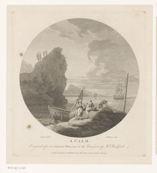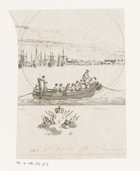 Curator: This engraving, "Ontmoeting tussen twee boten," which translates to "Encounter between two boats," dates back to 1837. The artwork, currently residing in the Rijksmuseum, is attributed to Johannes Steyn. The use of printmaking as the chosen medium brings with it its own inherent complexities. Editor: Oh, it’s got this hushed, romantic feel, doesn’t it? A story caught in a breath. The figures in their little boats feel so…contained. It's almost like a daydream fading at the edges. Curator: It is interesting you note this quality as it also prominently features typography in service of illustrating a family story. We have a combination of text and imagery working together within the same medium to enhance one another. The social context surrounding the use of print as a distribution method for storytelling adds another fascinating layer to consider. Editor: Exactly. And isn’t there a delightful, almost coy intentionality to the way they're staged? Like a carefully arranged tableau, waiting for the curtain to rise or maybe drop. And the texture…the way the engraver coaxed those subtle gradients and the meticulous detail... Curator: Yes, Romanticism emphasizes the value of these landscapes as symbolic carriers. Consider the conditions required for printmaking. The tools, labor, access, the materiality of ink and paper—they all shape the image as much as the hand of Steyn himself. How might we view labor, or even the consumption and production of family stories through such a material analysis? Editor: A worthy and important effort! But looking at it this way... there’s a certain stillness. It pulls you back to a slower time. It's an echo chamber for our own memories of lazy afternoons and whispered secrets. I mean, these people, those boats... They’re reflections, perhaps of hopes, lost connections and maybe stories we didn't read. Curator: True. I appreciate you drawing the audience to consider Steyn's material. Printmaking allows for multiplicity and consumption on a different scale, reaching wider audiences. I can appreciate it for how it demonstrates that narratives are both told and produced through multiple registers. Editor: Ultimately, I see this piece, less for the historical, and more for its tender gesture towards quiet contemplation.