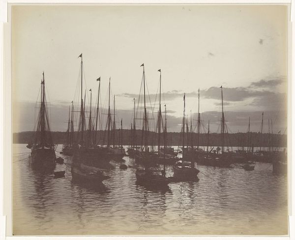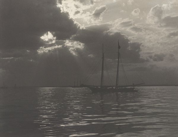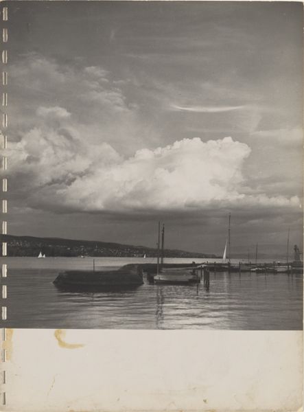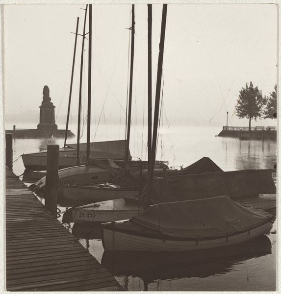 Curator: Ah, this photograph. Robert Frank's "Sailboats," likely taken sometime between 1941 and 1945. It's a gelatin silver print. Editor: There's something profoundly melancholic about this image. The way the light is diffused, the monochrome palette, and the bare branches framing the sailboats... it evokes a feeling of stillness and perhaps even a little loneliness. Curator: Yes, loneliness certainly resonates. The sailboat motif itself is quite old, and Frank may be drawing upon its connection to concepts of journeys and departures, perhaps unconsciously reflecting a wider, post-war mood of disillusionment. We have these small figures sailing away. Editor: Especially when contrasted with the stark, almost skeletal branches overhead. This immediately reminds me of writings around mortality; that idea of things decaying juxtaposed against hope symbolized in vessels carrying us away from something toward something else. Curator: And think about the symbol of water. What does the artist want to convey? In much iconography, water symbolizes the unconscious. Could the small figures be delving into their unconscious minds to sail? Editor: Maybe so, but let's consider context. World War II ended in '45, the latest possible year this was taken. There's something very powerful in bearing witness after immense loss. Could these vessels carry the symbolic weight of a community seeking refuge from oppression after liberation? Are we seeing here how symbols shift to fill contemporary voids? Curator: That's an intriguing idea—how readily those symbols adopt new interpretations depending on historical weight and need! What I admire here is the deceptive simplicity of Frank's choice. Sailboats at sea… but he imbues it with all of these potent layers. Editor: Absolutely. Frank's work serves as a reminder that art always operates within specific sociopolitical landscapes, intentionally or not. Even an image seemingly about sailing, embodies and documents so much. This small, somber square encapsulates so much of that specific moment in time. Curator: I agree, it is a simple yet striking portrait of humanity's search for peace, even within melancholy itself. It speaks to resilience as well. Editor: Beautifully put. Resilience found in both the continuation and re-invention of ourselves during these liminal and often fraught experiences.