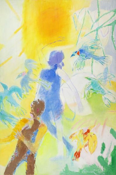 Curator: Looking at “The Red Park Bench,” I find myself captivated by the unsettling quietness within this park scene created by Charles Blackman. It has this ghostly appearance as if everyone's passing through this space of transience and social dynamics. Editor: Ghostly is a great descriptor. The first thing that struck me was how the texture and rendering give it this ephemeral quality, especially the blurring of figures against the more rigid form of the red bench itself. One wonders about his application of gouache. Curator: Indeed. Let's consider the subjects themselves; the ethereal quality of the woman in yellow could signal many ideas around gender, loss, or visibility within these spaces and their impact of alienation. Perhaps even an act of quiet resistance in the face of this lonely landscape. Editor: Right, and look at how that bench commands center stage. Red – symbolically charged with passion, anger, or even socialism – presented in such sharp relief, feels almost like an object extracted from some mass production line into a world defined more by human experience. Its bold materiality in a sea of softer shades…it stands out in that manufactured quality. Curator: The interplay between natural, built environment, and social dynamics seems significant. We cannot look away from how the space influences the characters and forms narratives between presence, or in the case of this piece, their invisibility. It questions our preconceived notions regarding social life and belonging, as they almost interact through these invisible spaces between the physical and nonphysical world. Editor: I'd agree. Focusing on those aspects provides a unique layer for examining this work; by looking at materiality we may also explore further class dynamics as it invites one to question these notions in production with accessibility across class lines by engaging with public facilities, in this case being “the bench.” Curator: I feel it is one to observe how this quiet landscape is also actively playing a vital role regarding the social implications present by their intersectionality and creating thought-provoking dialog. Editor: I appreciate that the experience offered here is an engaging example when intersecting in the same frame, there exists the potential that opens further conversations with social engagement.