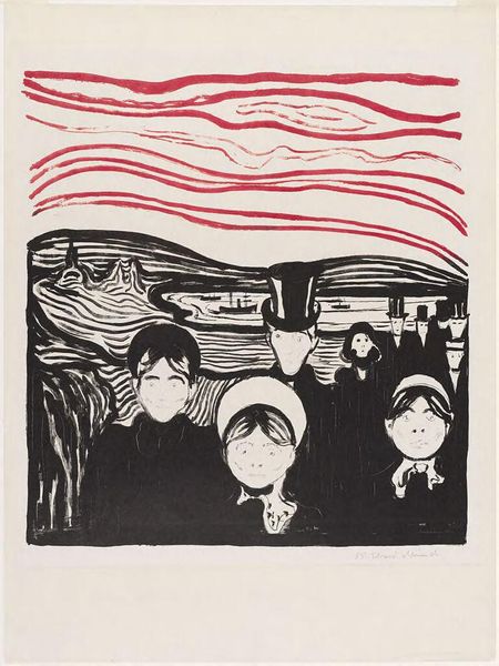 Editor: This is "Angst," a print made by Edvard Munch in 1896. The unsettling expressions really strike me. It’s almost like looking into a crowd where everyone’s experiencing the same quiet dread. What formal elements contribute to this feeling? Curator: The piece's formal strengths are undeniably striking. Let us start with Munch’s radical use of line. Observe the stark contrast in textures; from the furious energy in the sky down to the unnervingly smoothed figures. It all makes you wonder about the absence of tonal modelling across the figures. Do you not find that the crude carving emphasizes surface texture over realistic representation? Editor: Yes, definitely. It seems deliberate, the lack of detail adds to the feeling of anonymity. But, it appears Munch has simplified the figures to an unsettling degree. It reminds me of how anxiety can distort your perception, reducing people to flat, almost symbolic forms. The figures are more silhouettes than people. Curator: Precisely. Consider then the overall composition. The tight, almost claustrophobic arrangement, and the lack of conventional perspective. Where does your eye go first, and how does the composition then guide your viewing? Editor: My eye is drawn to the blank faces in the foreground, and then to the red, almost vibrating sky above, which creates an oppressive feeling. It almost feels like being trapped. Curator: Munch manipulates form, line, and space not for realism, but to viscerally transmit angst. Would you not agree it’s in the tension between the surface simplicity and the emotional complexity that its power resides? Editor: I see your point. By simplifying the forms and distorting the perspective, Munch focuses our attention on the emotional impact of the piece rather than on realistic details. Curator: Quite. And perhaps that focus on internal states makes the visual anxiety all the more potent. Editor: I hadn't considered the absence of context in itself a formal quality until now. Curator: Excellent! Focusing on form helps us decode this image.