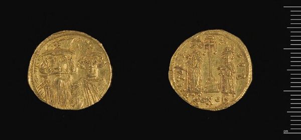 Editor: Here we have the Coin of Constans II, residing at the Harvard Art Museums. It's gold, and seeing these figures pressed into such a small space is impressive. What do you see in this piece? Curator: The coin’s artistic merit lies in its composition, particularly the bilateral symmetry achieved on both faces. Note the stylized depiction of figures, the linear quality of their drapery, and the inscription’s careful placement. How does the materiality—the use of gold—influence your interpretation? Editor: It makes me think about wealth, power, and permanence. So, the coin's value isn't just monetary; it's also about the message it conveys through its design. Curator: Precisely. The coin serves as a study in miniature form and symbolic representation.