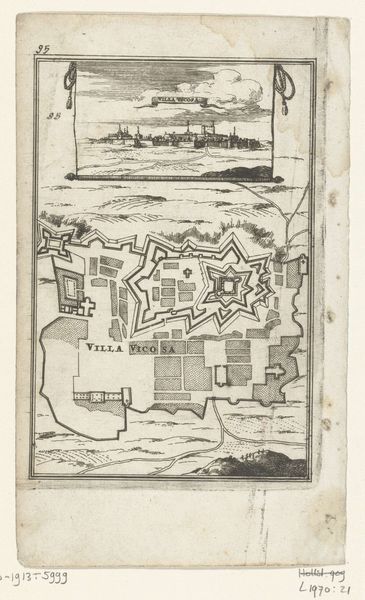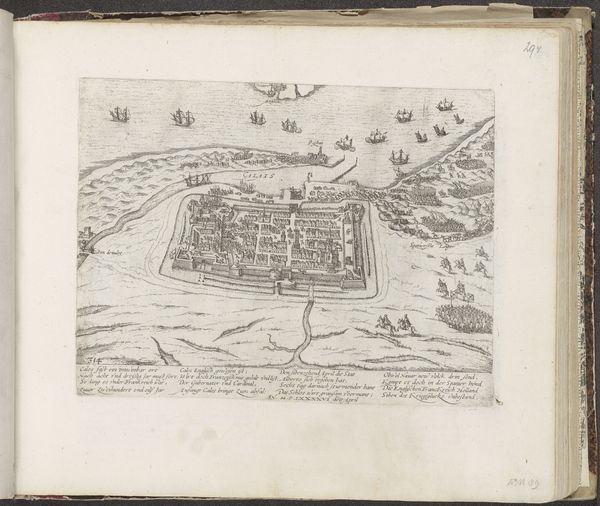 Curator: Here we have "The Capture of Calais by Archduke Albrecht," an engraving crafted between 1596 and 1598 by Frans Hogenberg. Editor: It’s remarkable how much detail he crams in; I mean, my initial impression is a swarm, a teeming little world caught in monochrome. A visual shout, I suppose, proclaiming "Here be events!". It looks almost like the plans for some incredibly complex clockwork toy fort that never quite got built. Curator: Yes, the density is noteworthy. It is evident Hogenberg sought to document comprehensively the siege. Consider the elevated perspective, mimicking a bird’s eye view: the etcher prioritizes legibility and comprehensive overview. Semiotically, this choice speaks volumes about the desired reception of the artwork; there is less attempt at romanticizing the violence, and more to deliver a didactic view, a document of the unfolding campaign. Editor: Do you think so? I see a bit more than pure reportage. All the tiny boats bobbing out at sea almost give it a festive air— like spectators at some morbid regatta. I find myself almost distanced from any possible true grimness by the artifice, this charming little box crammed full with the clamor of conquest. The eye flits from detail to detail. The lines are surprisingly loose and lively despite the static viewpoint. It feels less about pure chronicling than imbuing this moment with weight and making an event into history, and then packaging and shipping it off to the future, Curator: You raise a valuable point about imbuing weight. Formally, the very technique of engraving contributes to that sense of historical gravity. The precision, the deliberate lines etched into metal, it's a stark declaration of permanence. This stands in stark contrast to the ephemerality of the event it portrays. And notice, despite the overall flatness, Hogenberg manipulates hatching and line weight to create the illusion of depth. There’s a concerted effort to transcend the limitations of the medium. Editor: Precisely! While it does depict an actual siege and the reality it entails, it paradoxically renders the scene theatrical and safely contained, almost like figures arranged on a cake in an overly elaborate centerpiece. Funny that this work preserves that moment but also shields us from its reality behind layers of skillful fabrication and miniature recreation. I'm just really struck at how charming the brutality here appears to be, somehow. Curator: It offers then, an interesting meditation on how information and perspective modulate experience itself. Editor: So it does.