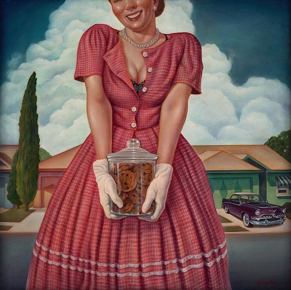 Editor: This oil painting, "Temperance," was created by Zoe Hawk in 2020. It gives off this strangely unsettling retro vibe. I find myself intrigued by the title, "Temperance," and wonder how it relates to the scene. What's your read on it? Curator: It's a compelling piece! Looking at it through a historical lens, the imagery suggests a carefully constructed presentation of feminine domesticity. We have this poised woman, meticulously pouring tea, set against a very deliberate composition of color. Is she really tempering anything, or is she enacting the ritual of appearing temperate? Editor: That’s an interesting point. I guess I just saw her pouring tea. What’s the painting hinting at that I'm missing? Curator: Well, think about the historical expectations placed on women. This painting stages itself in direct relation to those. How women have been presented in media, what was allowable, what was celebrated…it’s very calculated. Consider the limited palette, the somewhat stiff pose, the contained interior scene. Everything is highly controlled, perhaps suggesting what’s *not* being shown. Editor: So, maybe the title is ironic? Like, "Temperance" as a performance, not necessarily a reality? Curator: Precisely. And that tension is where the real power of the piece lies, I think. Hawk uses this seemingly simple genre painting to comment on much larger social and political ideas of identity and how women are perceived. Editor: I see that now. Thinking about this “performance of temperance” has changed my reading of the piece entirely. Thanks! Curator: My pleasure! Considering these aspects enriches our experience of the work. There are multiple layers of reading in a painting.