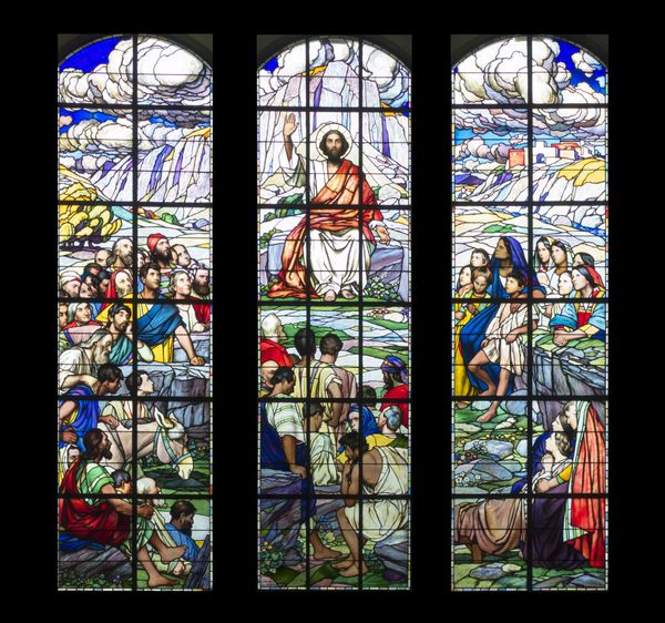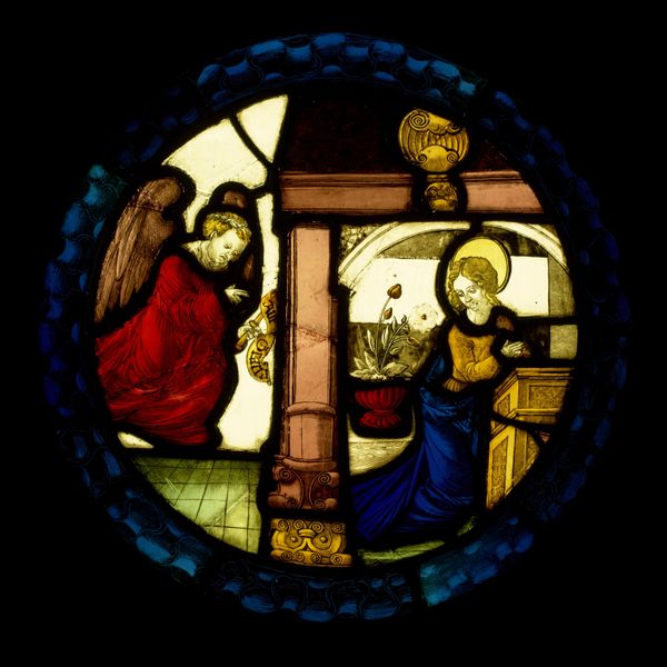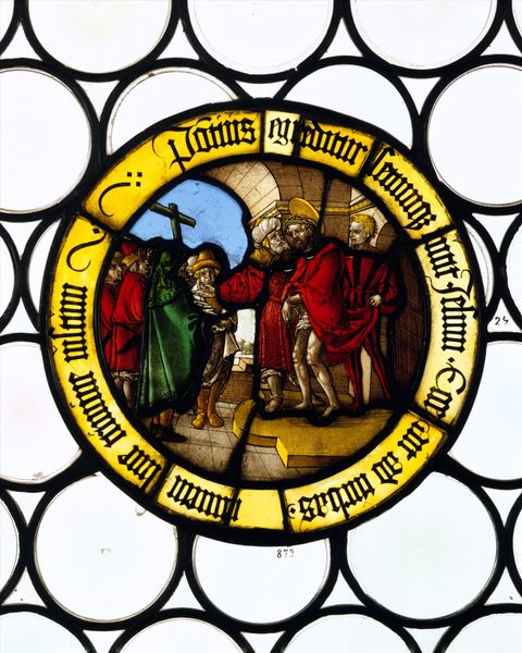 Editor: So, this striking stained-glass window is "Moses presenting the tablets of law," created in 1532 by Valentin Bousch. It's currently housed here at the Met. The colours are really intense and the whole scene seems… well, quite theatrical. What catches your eye most when you look at it? Curator: The window is beautiful and striking, isn’t it? I find myself drawn to the artist’s inventive blend of the monumental and the intimate. There is Moses, yes, almost glowing as a moral figure. But he is not alone, there are subtle reactions of the onlookers that almost serve as a commentary. Do you notice it, too? Editor: I hadn't really thought about the figures surrounding Moses, more like seeing them as accessories or part of the set-up for the character, rather than real contributors of sentiment or expression. That seems obvious now you say it. So much conveyed through their reactions. It's almost like people are experiencing something different. Curator: Exactly. Bousch isn’t just depicting a historical moment; he's giving us a scene full of very unique emotions about leadership, obedience, skepticism… It's humanizing a story, it almost transforms stained glass into theatre. And what of the medium itself, you know… light coming through colors has, over the centuries, been thought of as something deeply transformational in itself… do you imagine the people, centuries ago, experienced this art very differently from our current museum experience? Editor: Definitely. It makes you think about what other layers we might be missing in our viewing, how we're separated from its original context. Considering how transformative this would have looked back then helps it be transformational today. Curator: I agree. Each era brings a new way of witnessing.