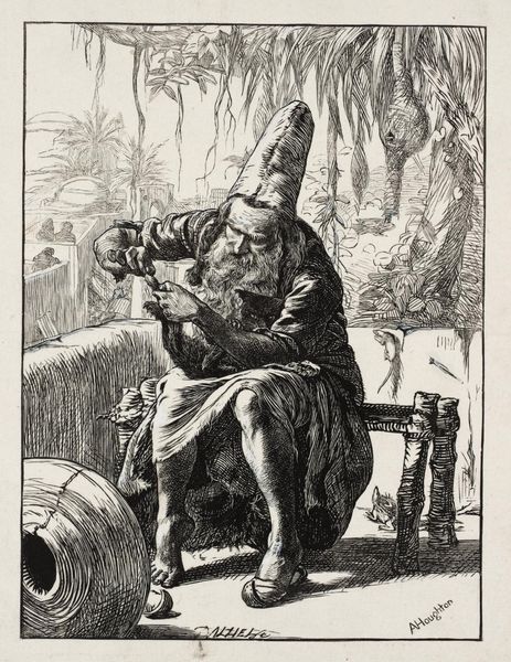 Gustave Doré created this illustration of Don Quixote with ink, focusing on sharp contrasts and intricate detail. The density of the hatching and cross-hatching gives the scene a palpable sense of depth and texture, almost overwhelming the eye. The composition is structured around a central tension: the restriction of Sancho Panza's appetite. Note how the doctor looms over Sancho, his disapproving gaze and raised rod forming a visual barrier against the feast laid out before him. The heavy use of shadow adds a psychological weight, emphasizing the conflict between desire and constraint. Doré uses the semiotics of dining to explore themes of power and control. The abundance of food, rendered in meticulous detail, symbolizes earthly pleasure. Yet, this pleasure is denied, highlighting the imposition of societal or medical authority over individual freedom. The stark black and white palette reinforces this sense of restriction, turning a potentially joyous scene into one of stark conflict.