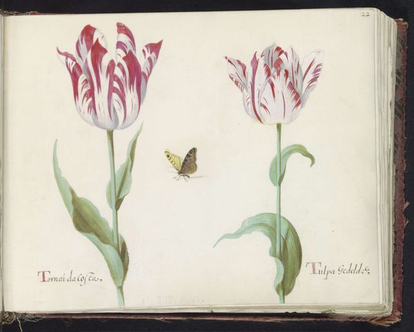 Editor: So here we have "Two Tulips with Butterfly" rendered in watercolor by Jacob Marrel, back in 1639. The delicacy of it is just striking, isn't it? Almost ethereal. What draws your eye when you look at this piece? Curator: Oh, it whispers of a world obsessed with beauty, and a dash of transience, perhaps? Imagine those tulips: sought after treasures then, worth more than houses! I see a dance between meticulous observation and the sheer joy of capturing light. Editor: More than houses? That's hard to wrap my head around for flowers... What was so special about these tulips? Curator: "Tulipmania!" Those striated petals were like nature's brushstrokes on a canvas, prized for their rarity. But it’s more than just pretty petals, though. Marrel gives us not just botanical accuracy, but almost a symbolic portrait of fleeting value, mirrored by that ephemeral butterfly. Do you get that sense of stillness? Editor: I think so. The butterfly does give it almost an allegorical quality. The meticulous detail feels...precious. Like he's immortalizing something. Curator: Exactly! Like pausing a moment before it flits away. Do you see how that pristine background intensifies that feeling? I think it suggests how fleeting life and beauty really are. It really makes me wonder, what will captivate us so intensely, centuries from now? Editor: It definitely makes you think about trends, doesn't it? Looking at this I won’t see just a beautiful botanical study. Thank you.