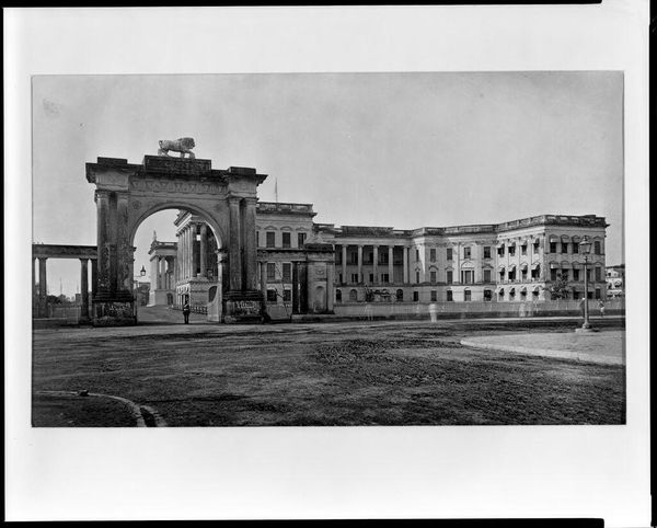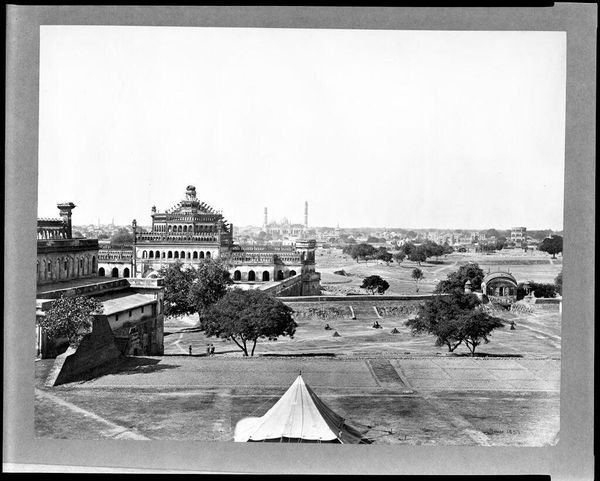 Editor: This is Samuel Bourne's photograph, "Fatehpur Sikri, Interior of Great Quadrangle Showing Sheik Selim Chisti's Tomb." It's a silver gelatin print that captures a vast courtyard. What strikes me is the way the architecture dominates the people, almost dwarfing them. What do you see in this piece? Curator: I see the British colonial gaze framing Indian architecture. Bourne was commissioned to document India, and these images served a purpose. How do you think this image might have been used or understood back in Britain? Editor: Perhaps as a symbol of British power, showcasing the scale and grandeur of what they controlled? Curator: Precisely. And how might that contrast with the experience of those living in and around Fatehpur Sikri at the time? Editor: I hadn't considered that perspective. It definitely adds a layer of complexity to this seemingly straightforward photograph.