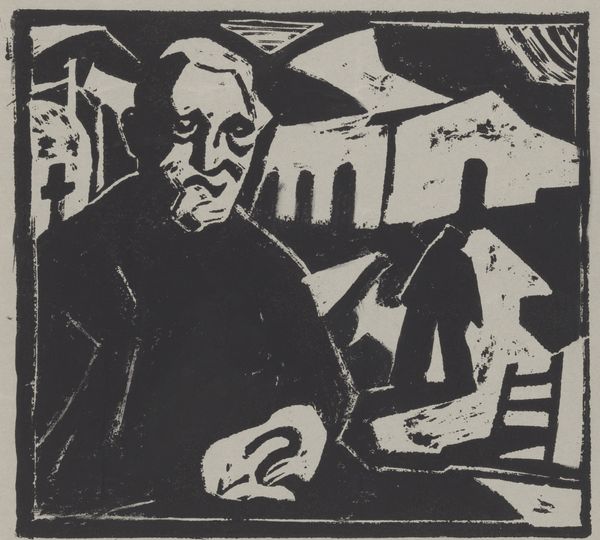 Curator: This compelling woodcut by Louis Cardinaals, titled "Zondag te Koudekerke," was created in 1932 and is currently housed in the Rijksmuseum collection. Editor: Immediately, the high contrast grabs my attention. There's a severity in the faces, amplified by the stark black and white. It feels almost… oppressive? Curator: Indeed. Let’s consider the woodcut medium. Carving demands direct engagement—force, pressure, removal of material. This process isn’t passive; Cardinaals actively shapes the image by physically engaging with the block. Each cut signifies a deliberate choice, a reduction of complexity to its most fundamental form. Editor: Right, and in terms of social context, the sharp contrasts could reflect the social and economic hardships of the 1930s. There's an almost documentary quality to it. The woman's traditional headwear and the man's stern gaze… it hints at a certain cultural rigidity, perhaps even social conformity in the face of external pressures. Curator: Consider, too, the relationship between foreground and background. The landscape seems to push forward, creating an almost claustrophobic effect. He employs bold, graphic lines. Editor: The stark lines, however, contribute to its emotional intensity. And the lack of shading denies any sense of gentleness. Everything is bold, unforgiving. I'm interested in exploring the potential link with Expressionism, perhaps even the New Objectivity movement—questioning traditional power structures within this small community. Curator: While the subject appears regional, even mundane, the technique elevates it. It speaks to a dedication of craft and skill but without artifice or unnecessary flourish. The image becomes more about the process of seeing, of physically engaging with the world to create a representation, rather than the specific scene depicted. Editor: Ultimately, what resonates most is the tension simmering beneath the surface of what might seem a simple, quaint depiction. The weight of tradition, perhaps the constraints of their environment, captured in that striking, deliberate carving. It is heavy with unspoken stories. Curator: Precisely. By exploring both the creation and context of this work, we get closer to seeing both the tangible process behind the print and how art interacts within larger social concerns.