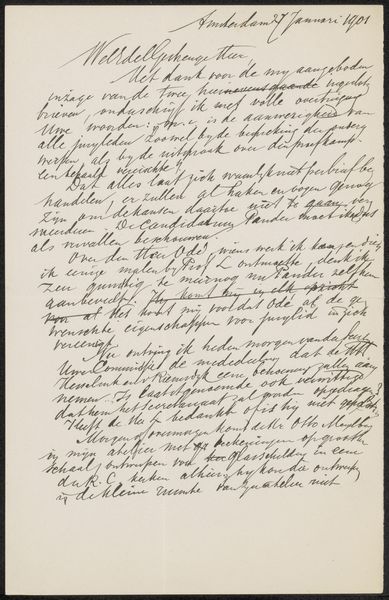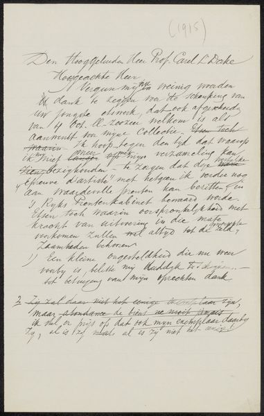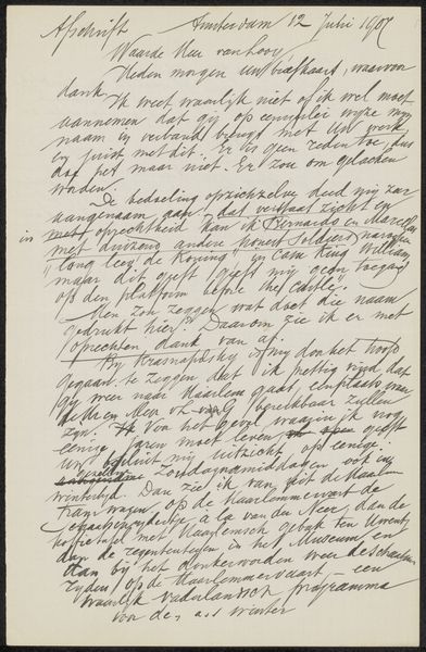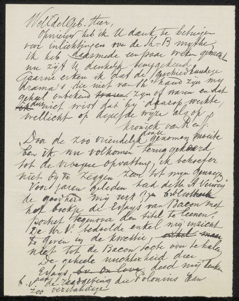 Editor: Here we have "Brief aan anoniem," or "Letter to Anonymous," possibly from 1914, by August Allebé. It's an ink and pen drawing, and I have to say, there's something incredibly intimate and mysterious about reading what appears to be a personal letter rendered as a work of art. What catches your eye in this piece? Curator: It’s interesting that you use the word “intimate.” As a historian, I consider how this letter exists within the broader context of art institutions. This isn't just a personal note; it's in the Rijksmuseum, making it a public document. Editor: I see what you mean! I hadn’t really thought about it that way, more about the writing being made public. Curator: Precisely. We can explore who was considered important enough for their private correspondence to become a matter of public interest. Consider the time: possibly 1914, right before World War I fully engulfed Europe. How might the looming anxieties of war influence Allebé’s perception of the letter's message? Editor: That makes a lot of sense! So, you're saying it's not just about the individual letter itself, but also the historical context of the time that is important. I hadn’t considered the societal context. Curator: Exactly. And further, the very act of preserving such writing can tell us about how historical and artistic narratives are selectively assembled by museums and other institutions. We have to acknowledge our biases in determining which writings get spotlighted. Editor: So, it prompts us to ask, "Why this letter, and not others?" Fascinating. Curator: Precisely. It also highlights the politics of whose stories are being considered important. We shouldn’t consider what’s physically in front of us but why we find it interesting. Editor: I see. I've learned that considering art involves historical context as well as considering institutions and politics. Thanks so much.