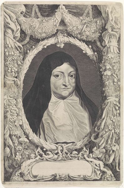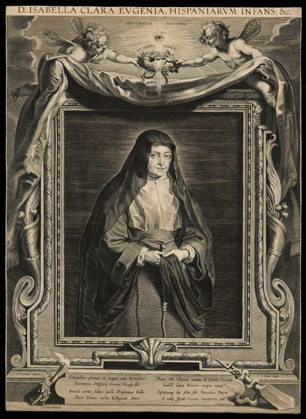 Editor: This print, "Portrait of Isabella Clara Eugenia, Infanta of Spain," by Paulus Pontius, probably dating sometime between 1616 and 1657, has a formality to it that's almost severe. The sharp lines create such a crisp image. How do you interpret this work, particularly its symbolism? Curator: Indeed. Notice how Isabella is presented not simply as a royal figure but also within a carefully constructed framework of symbolic meaning. Observe the angels holding a crown above her head. They're offering not just earthly regalia but divine endorsement. Do you see how that reflects the period's concept of divinely sanctioned rule? Editor: I do! It's as if her earthly power is validated by heavenly beings. And there’s an “all-seeing eye” above them – providence? Curator: Precisely! The "all-seeing eye," coupled with the words "Providentia" and "Avvsta" [sic], represents divine foresight and imperial authority. Pontius weaves her image into a tapestry of power, religion, and destiny. Look closely, too, at how her somber attire, the rosary, contrasts with the opulence of the decorative frame around her portrait. What does this tell you? Editor: Perhaps that while she held power, she was also deeply devout? Maybe the print served as a carefully constructed message to project both strength and piety? Curator: Excellent insight. The print freezes a particular understanding of her image for audiences near and far, reinforcing that image of piety through consistent imagery. The cultural memory constructed in print made it widely available for consistent symbolic understanding. Editor: That’s fascinating. I never considered how much a portrait could be an exercise in controlling a ruler’s legacy. Curator: Absolutely! Pontius captured not just a likeness but a carefully curated idea.