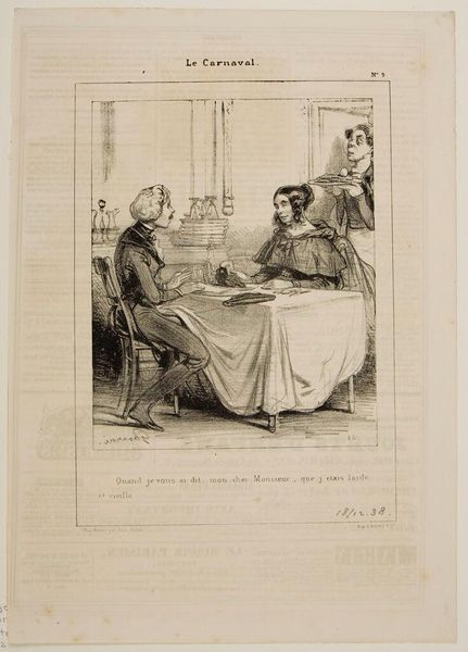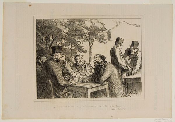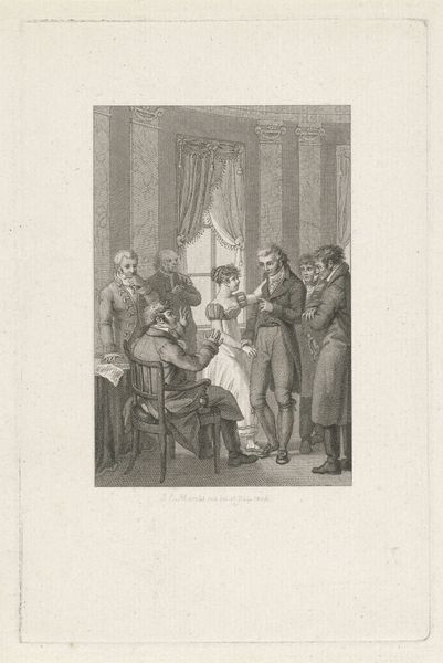 Curator: This is Auguste Raffet’s lithograph, "The Report of Contentment." Editor: It gives off an air of domestic tranquility, doesn't it? The composition is carefully arranged, drawing the eye to the reading man. Curator: Precisely. This scene plays upon a long tradition of the idealized family. The father reading signifies education and authority. Editor: But note how the light is distributed. It softens the father’s authority by equally illuminating the figures, thereby reinforcing a sense of collective contentment. Curator: And the dog—a symbol of loyalty—further affirms this mood. It's a visualization of bourgeois values. Editor: Raffet's careful use of cross-hatching creates subtle gradations in tone, which enhances the realism. It’s a well-constructed emotional tableau. Curator: It is a potent image. This little vignette reflects the values that society held dear, offering us a glimpse into their cultural memory. Editor: Indeed, a valuable insight into their visual language.