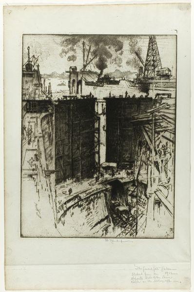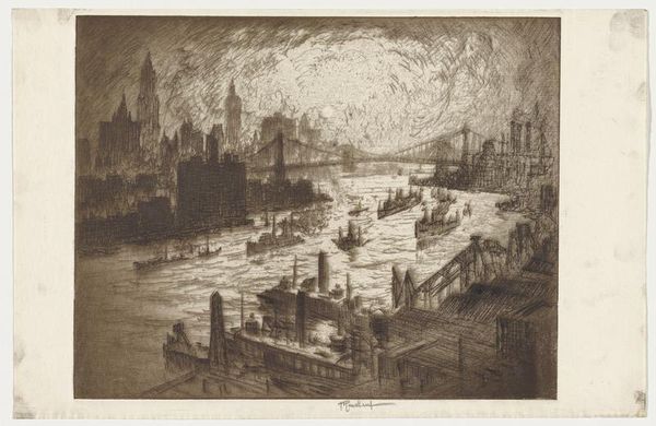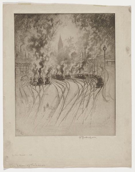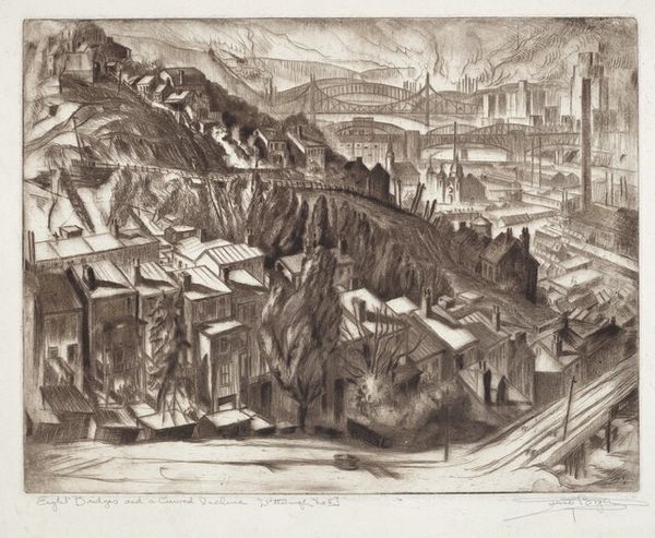Editor: This is Joseph Pennell's etching "The Great Stack," created in 1909. The buildings and smokestacks reaching for the sky make the city feel so imposing and powerful, almost suffocating. What do you see in this piece? Curator: What strikes me is the glorification of industry, set against what we know today about its human and environmental cost. The dense, almost suffocating composition can be read as a visual representation of industrial pollution and its impact on urban communities. Pennell's romantic portrayal masks a reality of worker exploitation and environmental degradation. How do you think viewers at the time would have perceived this work compared to our contemporary understanding? Editor: That's a really interesting point. Maybe back then, it was more about progress and growth, less about the human cost? I hadn't really thought about it that way. Curator: Exactly. The absence of people in the landscape, save perhaps as cogs within this "great stack", invites reflection upon the priorities being represented. It's a powerful reminder that artistic expression doesn't exist in a vacuum; it’s tied to the sociopolitical narratives of its time. Thinking about it this way, does that shift your perspective on the "power" you felt earlier? Editor: Absolutely. It makes me think about whose power is being celebrated here, and who is being exploited to build it. It adds a whole new layer of meaning. Curator: Precisely. Recognizing art's complicity in broader power dynamics opens up critical dialogues. I am grateful for your insight! Editor: Thanks for helping me to consider a different perspective. I will be sure to examine historical context to enrich my viewing in the future.