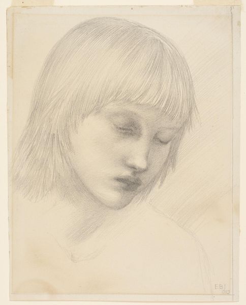Curator: Here we see Sir William Blake Richmond's "Portrait of a Woman," a pencil drawing from 1878, housed here at the Minneapolis Institute of Art. It's quite subtle. Editor: Yes, almost hauntingly so. There's a fragility that emanates from the paper itself, echoed in the woman’s gently tilted head and contemplative gaze. The almost monochromatic scheme feels incredibly intimate, as though capturing a private moment of reflection. Curator: The delicacy is striking. Richmond renders her with a classical simplicity. Notice the bare shoulders and tunic, referencing earlier artistic traditions, echoing ideals of beauty that extend back to antiquity. The headdress too lends a Hellenistic quality to the sitter, no? Editor: It does. But I also can't help but think about who gets memorialized, how women’s images were—and continue to be—historicized and often idealized within a patriarchal structure. There's a passivity suggested, even in the downturned glance. Who was this woman, and what stories were left untold by this depiction? Curator: That's a potent point. I'm struck by how her face becomes the primary field of symbolic meaning. We can sense in her features the weight of expectations. Richmond seems to invoke conventional portrayals while also allowing for some ambiguity, perhaps opening up space for later viewers to read something more subjective into her expression. Editor: Exactly. There’s also an undeniably Romantic quality to the pencilwork itself, the soft gradations suggesting both presence and ephemerality, as though her existence itself is a fragile impression on time. It forces us to confront not just representation, but absence. Who is erased within art history? Curator: Richmond captures a very specific mood. This piece clearly shows how portraiture can transcend simple likeness, engaging complex social and historical dialogues that continue to reverberate. It seems as simple as a sketch but embodies more nuance and many layers of interpretation. Editor: A single, fragile portrait holds a multitude of possibilities and historical layers waiting to be addressed. Hopefully these layers can guide more conversations of social commentary in portraiture as this piece surely challenges me to continue seeking for them.
