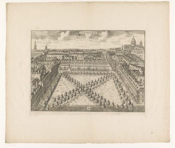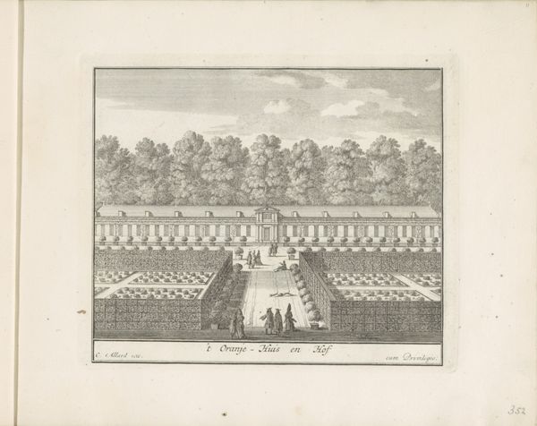 Editor: Here we have Willem Swidde’s 1695 drawing, “Uitzicht op de tuin vanuit slot Rosersberg”, made using engraving techniques. It depicts a highly structured baroque garden landscape, but the aged paper gives it such a sense of delicate transience. What stories do you see unfolding in this scene? Curator: This image offers a window into the rigid social hierarchies and control exerted through landscape architecture of the period. Gardens like this were not just pretty spaces; they were statements of power, reflecting a desire to dominate nature, much like the aristocracy dominated society. Do you notice how the perspective emphasizes control, placing the viewer in a position of overseeing, almost surveying, the land and its inhabitants? Editor: Absolutely, there’s definitely an element of surveillance at play, with all the sightlines perfectly manicured and overlooking every possible perspective, with these clear hierarchies between observer and observed... It also looks very artificial in that way. Curator: Precisely. And consider who had access to these spaces. It was largely the elite, reinforcing existing social boundaries. Swidde’s engraving, in a way, immortalizes this power dynamic, documenting it for posterity, while potentially highlighting the artificiality of such constructs through the fragility of the paper it is created upon. How does knowing this context change your perception of the artwork? Editor: I now view the drawing less as a beautiful scene and more as a documentation of societal inequalities and the construction of power. I appreciate it for showing the relationship between art and the social forces shaping its time. Curator: Exactly. By engaging with the artwork’s social context, we start questioning not only what is depicted but *why* and for *whom*. It is not merely a landscape but a record of power.