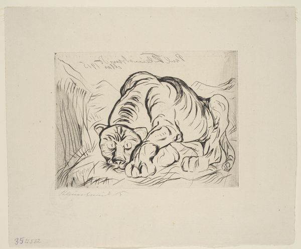 Editor: Here we have Edvard Munch's lithograph, "The Tiger," made between 1908 and 1909. The drawing seems almost unfinished, raw. It’s the texture of the pencil on the paper that really jumps out. What can you tell me about it? Curator: Well, let's consider the means of production. It's a lithograph, which involves a very specific type of labor to create the printing matrix, often industrial processes involving specific materials and specialized craftsmen. This contrasts sharply with the seeming spontaneity of the drawing. How do those seemingly contradictory forces work together? Editor: I guess it's easy to see it as just a drawing, but the process involved to make it reproducible, to create an edition... that changes my perspective. Was Munch thinking about the market when he made this? Curator: Exactly! The print medium suggests that, and also speaks to ideas around value, class, and access. Also consider the historical context: This piece comes after Munch’s nervous breakdown. Does the raw, unfinished quality of the work become more compelling considering his biography and the economic conditions surrounding artistic production at this time? Editor: Definitely, it feels like the material process is deliberately highlighting his state of mind. You can see the artist, in his own hand, processing trauma, but for an audience. It's both vulnerable and quite strategic. Curator: Yes, that duality, how private pain intersects with public consumption... Consider how the physical labor, the material constraints of the printmaking process, shapes and perhaps even mediates that expression. What does the commodification of inner turmoil say about society at the time, and today? Editor: I hadn't considered the labor and the commodification of feeling, but looking closer, I can't unsee it now. It shifts my focus from the subjective expression to its position in the market and the conditions of its creation. Curator: Precisely. By examining the artwork through this lens, we start to question assumptions and deepen our comprehension, seeing it not just as personal expression but as the result of cultural and economic systems.