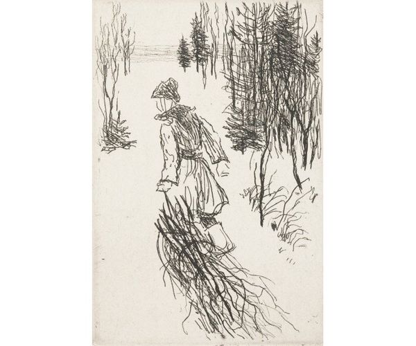 Curator: What a charming sketch! This is "La Livreuse Sous La Pluie" by Théophile Alexandre Steinlen. Editor: It’s immediately evocative, isn't it? The muted colors, the hurried lines, it really conveys a sense of dreary weather and movement. Almost like a snapshot, raw and unpolished. Curator: Steinlen was deeply engaged in social issues. This image, though simple in its rendering, speaks volumes about the working class experience in late 19th century Paris. You can almost feel the societal pressure placed on this woman. Editor: I’m particularly drawn to the umbrella, how it dominates the scene but seems to offer minimal protection. Symbolically, it speaks to a sort of superficial defense against hardship. Curator: Absolutely. And look at her dress, clinging to her body in the downpour. Her posture reflects both resilience and vulnerability – perhaps indicative of the precariousness of her position in a male-dominated society. Notice also how Steinlen subtly places a scavenging dog beside her in the lower corner of the composition; mirroring a common trope wherein single women's morality was correlated to the perceived loyalty of their canine companions. Editor: And there’s a lovely, almost humorous contrast in how that scruffy dog seems unfazed, while the woman seems burdened, bowed beneath the weather and, as you say, societal expectations. The way Steinlen captured the energy of that little mutt is intriguing – representing basic instincts and lack of social obligations that perhaps stand in opposition to the responsibilities that society places upon women like this messenger. Curator: Indeed. Consider the weight of that delivery she's carrying, compared to her relatively slender form. Steinlen isn't just presenting us with a genre scene; he's inviting a critical examination of labor, gender, and class. The implication that she is walking in high-heeled shoes under these poor weather conditions heightens the implied commentary on economic disparity, as they function simultaneously to create feminine charm and mark her as unable to escape gender performance. Editor: So even in this fleeting sketch, a whole story unfolds – struggles, endurance, perhaps even a bit of quiet rebellion. Curator: Precisely. It’s a piece that gains depth the more we look at it. Editor: I find I see something new each time. It speaks to the layers beneath the surface, as art should.