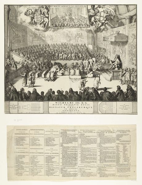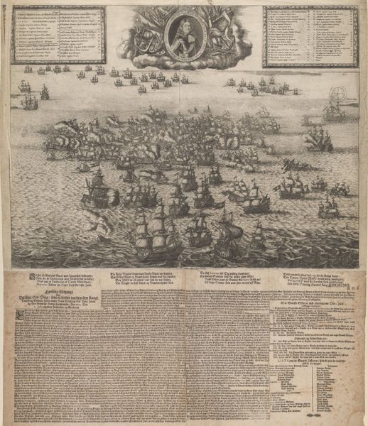 This etching, "Executie van de samenzweerders tegen Maurits" made in 1623 by Nicolaes van Geelkercken, visualizes a dramatic historical event with a stark formal clarity. The composition is divided horizontally, presenting a bird's-eye view above and a series of detailed scenes below. Notice how Geelkercken uses linear perspective to draw our eye towards the distant horizon, yet the density of the crowd resists a sense of depth. The stark contrast between the dark, teeming masses and the light open spaces creates a visual tension, emphasizing the gravity of the executions. The lower register depicts the brutal acts of justice, each figure rendered with meticulous detail, almost as if to dissect the unfolding drama. Geelkercken employs a semiotic language of order and chaos, control and violence, revealing the intricate power dynamics at play. The print destabilizes any singular reading of justice, inviting us to question the spectacle of punishment and its broader implications within the social and political context of the time.