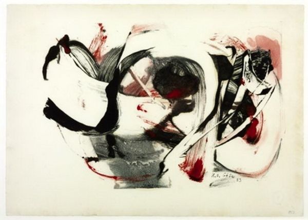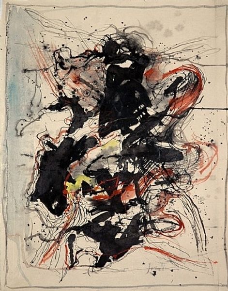 This untitled work was created by Sam Gilliam, with ink on paper. Look how the ink just drips and flows across the page, like a jazz solo on paper. It feels so immediate, so process-oriented, like the act of making is the whole point. The black ink dominates, thick and thin, opaque and transparent, but then bam! A few strokes of red pop, adding this little jolt of energy. The surface is so alive, you can almost feel the artist's hand moving, splattering, and drawing. There's this one spot near the bottom left where the black ink clumps together, almost like a little storm cloud, and it anchors the whole composition. Gilliam, like Helen Frankenthaler, with her soak-stain technique, knew how to let the medium do its thing, embracing the accidental and the unpredictable. It’s a reminder that art is an ongoing conversation, a constant exploration of what materials can do.