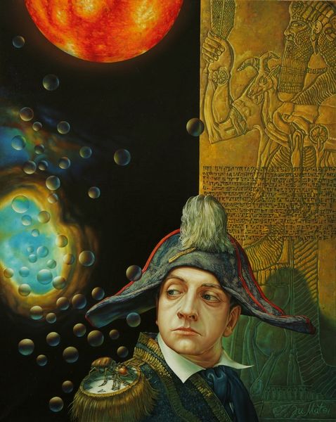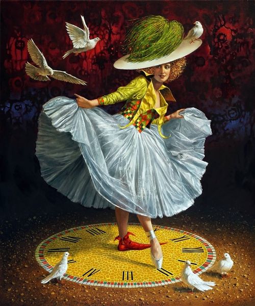 Michael Cheval created this painting, "Neophyte’s Joy," which is imbued with surreal and theatrical elements. Cheval was born in 1966, in what was then the Soviet Union, and his art often juxtaposes dreamlike settings with historical allusions. In this work, a young woman in what appears to be eighteenth-century attire is holding bagpipes and a book, while a birdcage sits atop her elaborate hairstyle. The painting evokes a sense of historical pastiche, blending elements that might signify enlightenment, like the globe and the bust of a philosopher, with the romanticized, cultural signifier of the bagpipes. The woman’s engagement with both the book and the musical instrument presents a tension between intellectual pursuits and artistic expression. Does she represent a modern woman engaging with a romanticized past? It’s as if the painting is asking us to consider how we reconcile our identities with our histories. The result is a sense of joyful confusion.