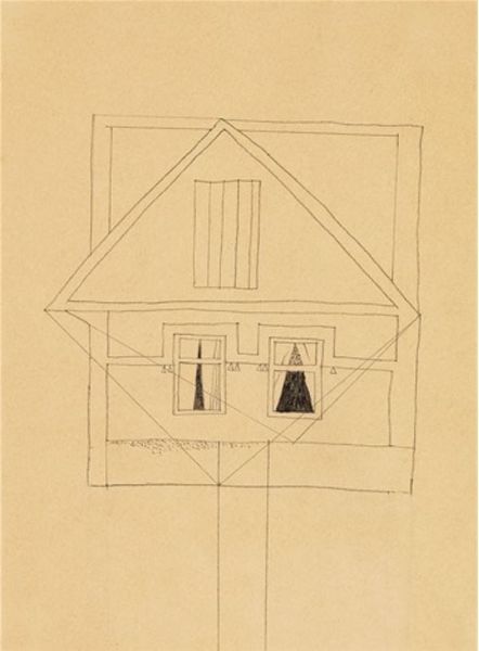 Editor: So, this is Vajda Lajos' "House with Flowerly Windows," a pencil drawing on paper from 1936. It feels strangely… intimate, like a glimpse into a private dream. The perspective's a bit wonky, almost childlike. What do you make of it? Curator: Intimate is a wonderful way to put it. It feels like a memory, doesn't it? Almost faded, drawn from the recesses of the mind. Notice how the house is both incredibly simple – just basic geometric shapes – and deeply complex in its details, like the...are those plants, teeming behind the window? Editor: Yeah, "flowerly windows," it says. A very loose interpretation, though! Curator: Exactly! They're not photorealistic depictions; they’re emotional symbols. Vajda Lajos was deeply interested in surrealism and personal mythologies. He was exploring the inner landscape. What feelings does this house evoke in *you*? Editor: I think it feels melancholy, maybe. The faded paper and simple lines suggest a fading memory of something important. There is also a hint of cubism or analytical art style Curator: Melancholy... I love that. There's a Hungarian word, "bánat," which is a profound sense of longing and sorrow. It almost perfectly captures the feeling I get here. The geometric construction combined with the fragile lines creates a beautiful tension, doesn't it? It also makes me wonder: does the perspective hint that these "flowers" may only live inside the room? Is it just the windows that carry the colors and warmth to this almost derelict construction? Editor: I hadn't thought of it that way! So, it’s less about architectural accuracy and more about capturing a mood? Curator: Precisely! It is his way of understanding his environment: each line holds significance and connects to personal experiences. It isn’t so much *what* he’s drawing, but *why* he is, what thoughts or feeling compel to. Editor: Wow. I see it in a completely different way now. It's amazing how a simple drawing can hold so much. Thanks. Curator: The pleasure was all mine! Art is, after all, an ongoing conversation, isn't it? One we keep having with the artists long after they’ve put down their pencils.
