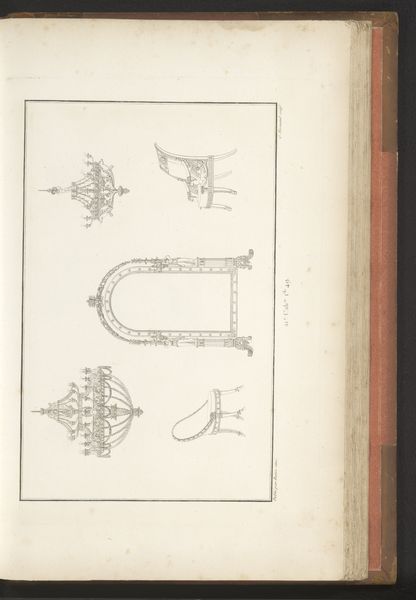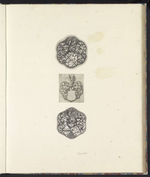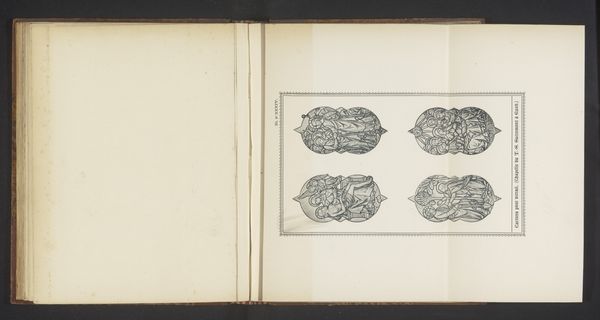 Curator: Here we see a printed image, likely from before 1866, reproducing five wooden reliefs with biblical scenes. The image is credited to Joseph Maes and depicts an exhibition from 1864 in Mechelen. What's your first impression? Editor: The effect is almost ghostly. These small carvings, displayed against the stark page, seem to hover between preservation and obsolescence. There’s a clear reverence for the medieval aesthetic, yet the monochromatic presentation flattens them somehow, stripping them of their tactile qualities. Curator: It's interesting how you note the flattening, given the image actually documents an exhibition that deliberately invoked historical and religious sentiment during a period of nation-building in Belgium. Exhibitions like this sought to construct a cohesive national identity, drawing heavily from a romanticized past, especially medieval art and religion. Editor: Precisely. Consider the motifs themselves. We see familiar scenes: Christ enthroned, perhaps a crucifixion, the Virgin and Child. These weren’t just aesthetic choices. The repetition of these recognizable motifs anchored cultural memory; it connected contemporary viewers to what they were expected to understand as the foundation of their shared Christian European identity. Curator: Exactly. Furthermore, placing these objects—originally meant for private devotion or ecclesiastical settings—into a public exhibition transformed their function. They became artifacts within a larger narrative designed to instill national pride, obscuring their individual histories and significance in favor of a grander, perhaps politically motivated, tale. Editor: And in rendering these objects as flat images, even the texture and the lived historical context become secondary. Consider how this shift might have influenced perceptions of the past, flattening complex narratives into simplified visual emblems. Curator: This reminds us that even the act of displaying art is never neutral. It’s always entangled with cultural, political, and ideological considerations, deliberately creating narratives around the exhibited items. Editor: It prompts questions about how we build identity and memory and about whose stories get highlighted. This ghostly print reveals a powerful message about cultural heritage as both preserved and presented.