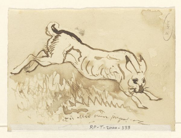 Curator: Looking at this striking ink drawing from what we estimate to be between 1880 and 1882, we see Johannes Tavenraat’s “Patrijzen!”, housed right here at the Rijksmuseum. Editor: The dog is absolutely electric! I can almost hear its panting breath, sense that muscle-tense focus before the chase. Curator: Precisely. The energy is palpable, even across more than a century. What Tavenraat captures so brilliantly, beyond just a representation of a hunting dog, is that intensity. In the context of the late 19th century, depictions of animals—especially within hunting scenes—served as a commentary on human dominance over the natural world. Do you feel this applies here? Editor: Not especially. This isn't about dominance to me; it feels more like partnership. Like, I get the sense the artist admired that creature— the powerful way it moved through the world. Curator: Yes, perhaps Tavenraat seeks to blur that human/animal divide. Through the swiftness of his strokes and the dynamic posture of the dog, we glimpse something more reciprocal in the interaction, maybe an uneasy blurring. This invites questions around the ethics of hunting itself, framing it, not as a pure display of power, but with possible complicity. The looseness of the ink washes contrasts to me, deliberately, with the violence the scene suggests. Editor: You’re right to highlight the medium. It isn't clinical, it’s all flowing lines and implied form, all immediacy. Like a half-remembered dream about the thrill of the hunt. So many landscapes featuring the same palette come off flat; he sidesteps all of that. Curator: Which I think reinforces the sense of movement and temporality he wanted to highlight. Tavenraat asks us to confront complex themes around how we engage with the natural world. It invites contemplation, rather than simple admiration, for his skillful drawing. Editor: For me, it is a successful picture first, before any critical reading. And a beautiful example of economy: maximum feeling with minimal fuss.