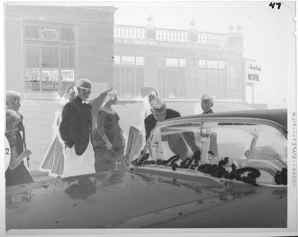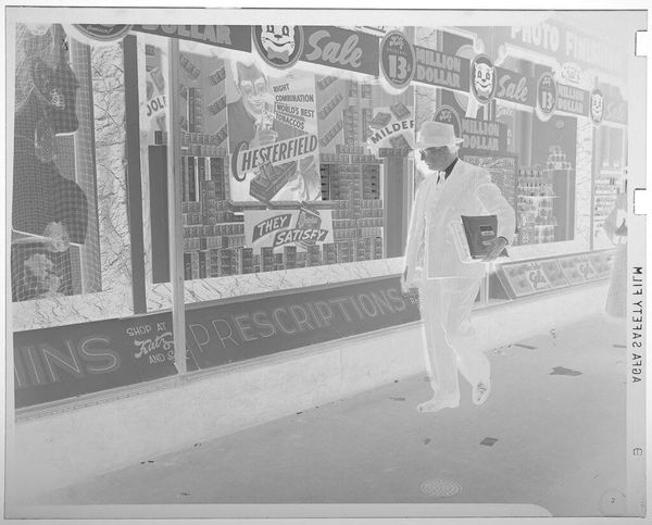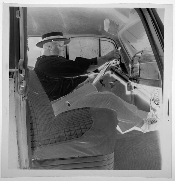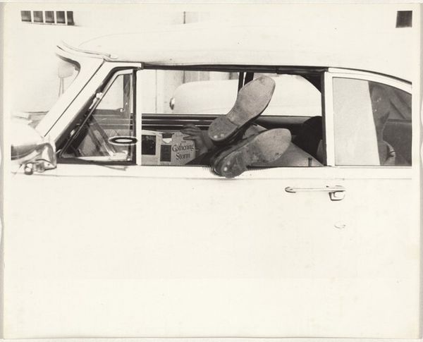 Editor: This photograph, "Untitled (V J day: man handing bottle to man in car)" by Jack Gould, is quite striking. The man offering the bottle seems so casual, almost ordinary, yet the context suggests a moment of great celebration. How would you interpret this work? Curator: It’s fascinating, isn’t it? To me, this isn't just about a drink; it’s a visual toast. The everyday action becomes a symbol of shared relief and hope after the war. What do you think that bottle holds beyond just liquid? Editor: Maybe a collective sigh of relief, bottled and passed around? It definitely makes you wonder about the untold stories behind the image. Curator: Exactly! And in a way, we are all a part of that story, aren't we?