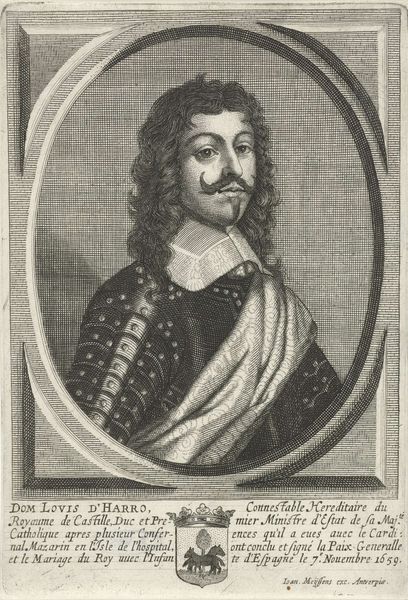 Editor: We’re looking at a print, “Portret van Francisco de Melo” made sometime between 1604 and 1670 by Crispijn van de Passe the Younger. It’s currently held at the Rijksmuseum. The Baroque style portrait has a serious mood, a kind of stiff formality that strikes me. How do you interpret this work? Curator: Well, its formality speaks volumes, doesn’t it? Think about the socio-political climate: Melo was Governor General for the King of Spain. Baroque portraiture, especially prints like this one meant for wider circulation, were tools of power. Consider how the inscription frames him— literally and figuratively. What does it tell us about how Melo wanted to be perceived, or how Spain wanted him to be seen? Editor: I suppose the Latin inscription emphasizes his credentials, creating this image of legitimacy. The pillar in the background on the right of his head feels significant as a kind of symbol, too, doesn't it? Curator: Exactly! That classical column is a deliberate invocation of Roman authority. But also, prints democratized imagery; while only some could commission painted portraits, engravings allowed for broader dissemination of power and influence. Did this broader reach alter perceptions of class? Editor: That’s interesting – I hadn’t thought about that! It complicates the idea of the elite because prints would let a far greater variety of people become acquainted with Don Francisco de Melo's likeness and achievements. So this artwork is interesting in how it served the ruling class, and how it redefined their public image and impacted the wider public? Curator: Precisely! It allows us to investigate how identity, authority, and propaganda intersect in the early modern period. Editor: I'll certainly view such images with more awareness in the future. Thanks!