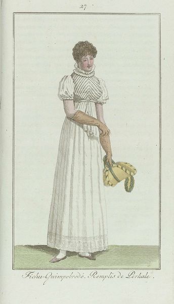 Curator: This delicate print, "Elegantia, of tijdschrift van mode, luxe en smaak voor dames, Augustus 1807, No. 19: Chapeau de Paille coup\u00e9e..." dates back to 1807, originating here in the Rijksmuseum. Its origins are anonymous but we know it features drawing techniques with printmaking. What’s your first impression? Editor: My immediate reaction is its sense of reserved elegance, tinged with a quiet rebellion. The color palette is so subdued, almost like a watercolor dream, yet there's a fascinating tension in the dress’s construction, a controlled exposure, so to speak. Curator: It's intriguing how the print situates itself within a growing fashion industry. Consider the title – "Elegantia" – indicating it was a published magazine dedicated to "mode, luxe en smaak" — fashion, luxury, and taste. The very existence of such publications underscores the rise of consumer culture, dictating ideals of feminine beauty. Editor: Precisely! The print becomes a site of negotiation between individual expression and societal expectation. The high-waisted empire silhouette and delicate fabrics speak to an era of neoclassical revival, while the figure's posture—demure yet self-assured—hints at the complex roles women were navigating at the time. What does the material execution itself suggest? Curator: Well, consider the print medium itself, allowing for widespread dissemination of this style. It offered aspiring women a glimpse into an exclusive world, providing accessible instruction on how to craft these desirable items, even if only imitations. The image democratized high fashion, even though accessibility remained limited by socioeconomic status. Editor: And think of the labor embedded in each stitch of that garment, or the hours of production that went into the creation of the print. These elements get obscured by the focus on aesthetic appreciation, yet are crucial to understanding its social and economic context. There’s a real power dynamic there – from field to fashionable frock. Curator: It all speaks to a burgeoning marketplace shaping identities. These fashion prints didn’t merely mirror trends, they actively crafted them, shaping the desires of women and informing the burgeoning fashion and textiles industry. Editor: Looking at this piece reminds us that what we consider "fashion" isn’t simply frivolous. It's a powerful language loaded with symbolism, reflecting social and political undercurrents in a given era. Curator: It certainly gives us a unique window into early 19th-century material culture. Editor: Absolutely, and underscores the complex interplay of power, labor, and aspiration that continues to inform our understanding of fashion today.