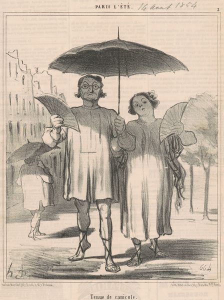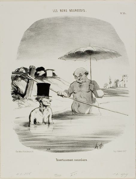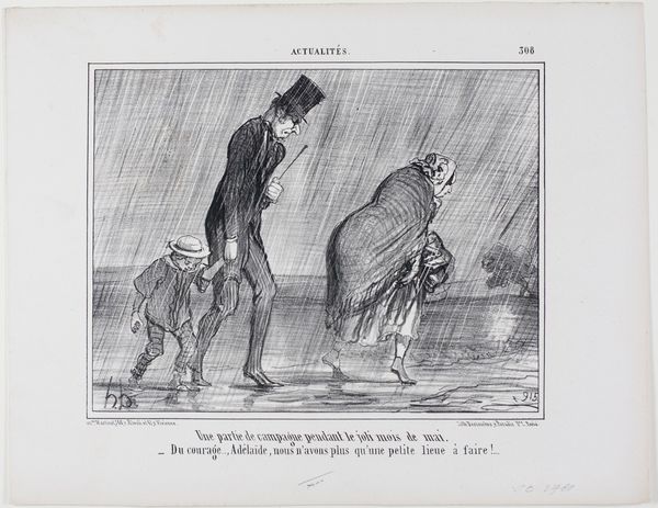 Editor: This lithograph, "Au Camp de Chalons," was created by Honoré Daumier in 1869. The figures, caught in the rain, seem oblivious to the bleakness, except perhaps for the child, who’s pointing towards a line of distant soldiers. What’s your take on this piece? Curator: Daumier was a master of social commentary, and here, his caricature blends seamlessly with political critique. This print was created during a period of significant political tension in France. Consider the title "Au Camp de Chalons." What does this location evoke for you, knowing this was just before the Franco-Prussian War? Editor: I can only guess that Chalons was a large army camp... Maybe they were seen as unprepared for what came next? Curator: Exactly! The caption translates to “to teach them how to go into the fire.” Is Daumier suggesting the leaders were carelessly sending soldiers to their deaths. Look at how he juxtaposes the comfortable bourgeois family with the barely-visible soldiers; what comment does that juxtaposition make, especially considering class divides at the time? Editor: So he is criticizing the bourgeoisie for being detached from the reality of war, maybe? It sounds like powerful satire that’s very pointed. I’m also curious, is the bad weather of that time relevant at all? Curator: Definitely! Weather serves to evoke how war isn't glamorous: it's grim and uncomfortable and tragic. Thank you, this new reading also shed light on new information on that historical background! Editor: Thanks, it also changed how I'll interpret similar art in the future!