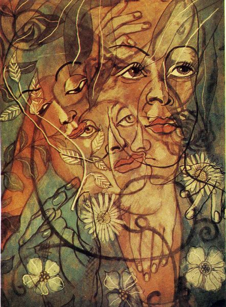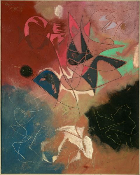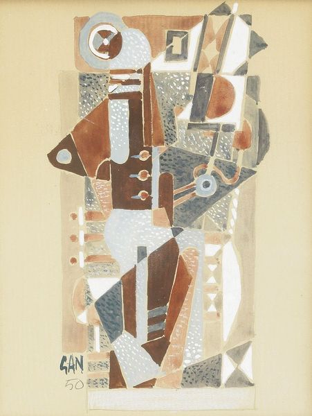 Editor: So, this is Paul Klee's "A Young Lady's Adventure" from 1921. It's an oil and watercolor painting on paper, and I find its earthy tones and abstract figure quite intriguing. What's your take on this piece? How do you interpret this work in its historical context? Curator: Klee's piece, made just after WWI, speaks volumes about the shifting position of women in society. Look at how the figure is constructed—geometric shapes, fragmented, yet also presented with a degree of agency symbolized by the red arrow. Editor: Agency, that’s interesting! The red arrow certainly seems directional. But is she really "adventuring?" What would that mean in 1921? Curator: Exactly! Consider the period—women's suffrage movements were gaining momentum. Klee might be suggesting a break from traditional constraints. The figure isn't confined; she navigates a space of abstract possibilities. The slightly masked facial features? Could symbolize the facelessness of women at the time, wanting more recognition, perhaps? Editor: Hmm, the masked face—I hadn't thought about that! I was so focused on the playful shapes and the title’s implied narrative. Do you think the “adventure” is about personal liberation then, more than literal exploration? Curator: Precisely! Think about how post-war expressionism gave artists the language to dissect inner experience alongside social critique. Klee doesn't present a realistic image of woman; he presents a landscape of burgeoning self-discovery and redefinition. It is a deliberate composition; from her torso shape and downwards, all the colours look desaturated suggesting she is at a threshold in life. Editor: That makes a lot of sense. Now I'm also wondering what role abstraction plays. Curator: Abstraction enables Klee to bypass societal expectations and instead get at universal and ambiguous, perhaps timeless issues surrounding identity and experience. Instead of seeing a "lady," we're invited to engage with a construction of womanhood—one of movement, potential, and resistance. Editor: Okay, I'm definitely seeing the painting in a new light now. Thank you. Curator: Of course. Looking beyond the formal aspects and really digging into the ‘why’ allows us to recognize the complex layers Klee embedded within "A Young Lady's Adventure," prompting further analysis of its themes related to identity, gender and power.